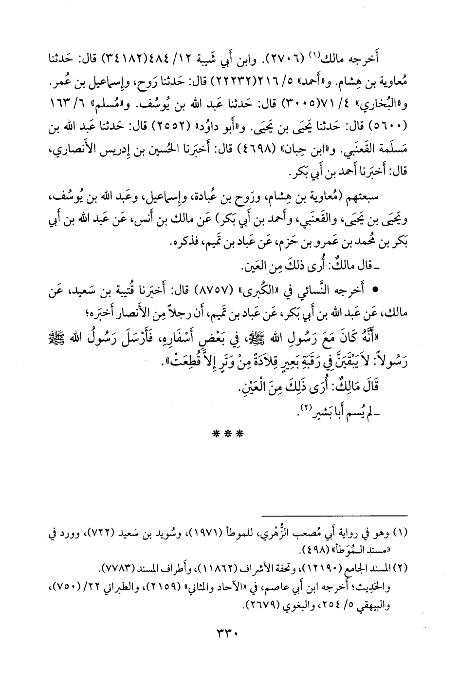 سبعتهم (معاوية بن هشام، وروح بن عبادة، وإسماعيل، وعبد الله بن يوسف، ويحيى بن يحيى، والقَعنَبي، وأحمد بن أَبي بكر أَبو مصعب الزُّهْري) عن مالك بن أنس، عن عبد الله بن أَبي بكر بن محمد بن عَمرو بن حزم، عن عباد بن تميم، فذكره.