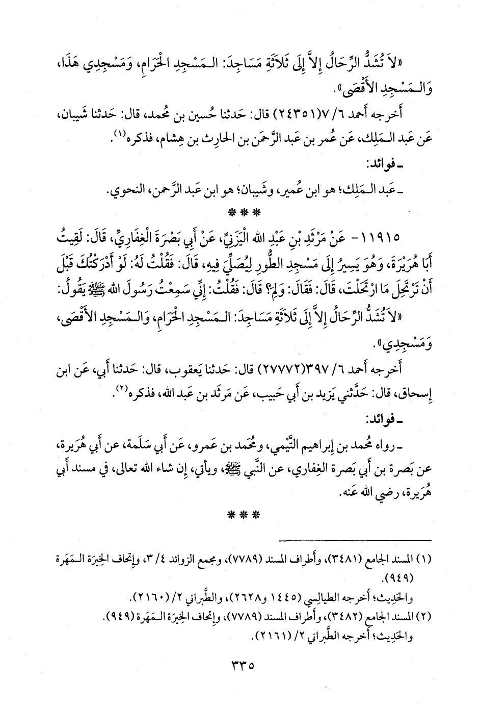 ١١٩١٥ - عن مَرثد بن عبد الله اليزني، عن أبي بصرة الغِفاري، قال: لقيت أبا هريرة، وهو يسير إلى مسجد الطور ليصلي فيه، قال: فقلت له: لو أدركتك قبل أن ترتحل ما ارتحلت، قال: فقال: ولم؟ قال: فقلت: إني سمعت رسول الله صَلى الله عَليه وسَلم يقول: