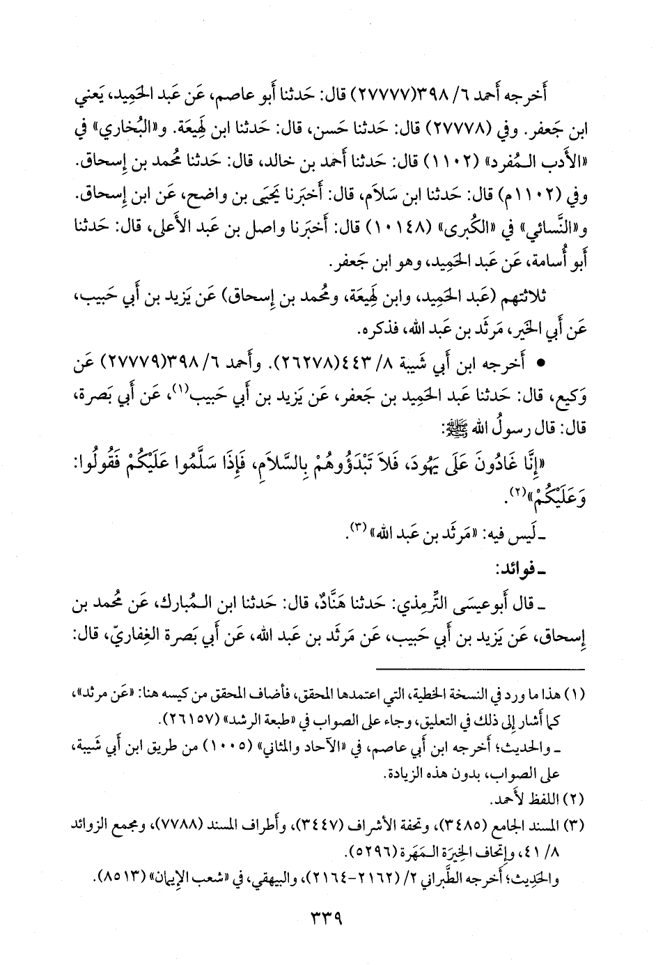 (¬١) هذا ما ورد في النسخ الخطية المعتمدة في تحقيق طبعات دار الرُّشد والقِبلة والفاروق وإِشبيليا لمصنف ابن أبي شيبة، لكن محقق طبعة دار القِبلة محمد عوامة أثبته هنا: «عن يزيد بن أبي حبيب، عن مَرثَد بن عبد الله اليزني، عن أبي بصرة الغفاري»، زاد فيه من كِيسه: «عن مرثد»، وجاء على الصواب في طبعَتَيْ دار الرُّشد وإِشبيليا، و «الآحاد والمثاني» (١٠٠٥) إذ أخرجه من طريق ابن أبي شيبة، و «مسند أحمد» ٦/ ٣٩٨ إذ أخرجه من طريق وكيع بن الجراح شيخ ابن أبي شيبة فيه.