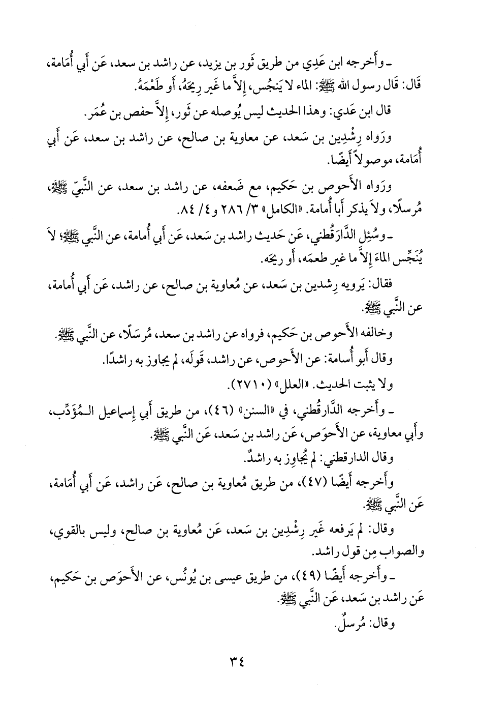 - وأخرجه الدارقُطني (٥٠)، من طريق أبي أُسامة حماد بن أُسامة، عن الأحوص بن حكيم، عن أبي عون، وراشد بن سعد، قالا: الماء لا ينجسه شيء، إلا ما غير ريحه أو طعمه. «موقوف».