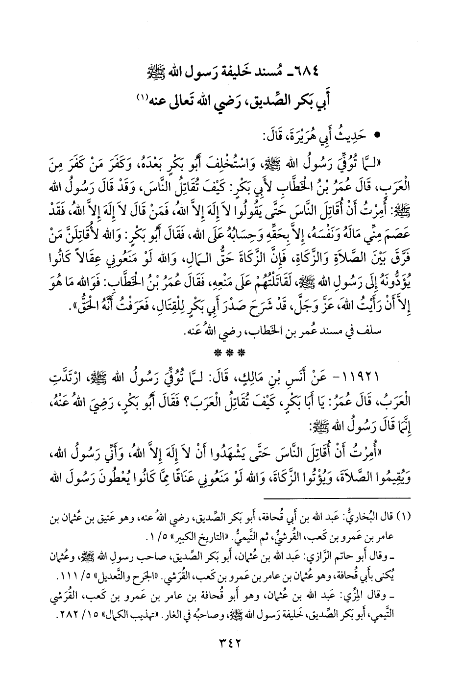 ١١٩٢١ - عن أَنس بن مالك، قال: لما توفي رسول الله صَلى الله عَليه وسَلم ارتدت العرب، قال عمر: يا أبا بكر، كيف تقاتل العرب؟ فقال أَبو بكر، رضي الله عنه، إنما قال رسول الله صَلى الله عَليه وسَلم: