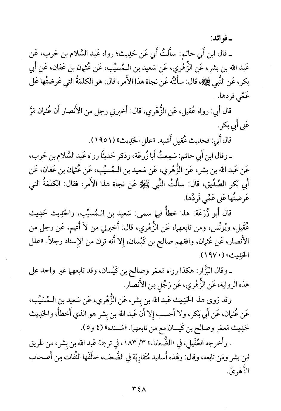 - قال عبد الرَّحمَن بن أبي حاتم الرازي: سألتُ أبي عن حديثٍ؛ رواه عبد السلام بن حرب، عن عبد الله بن بشر، عن الزُّهْري، عن سعيد بن المُسَيب، عن عثمان بن عفان، عن أَبي بكر، عن النبي صَلى الله عَليه وسَلم قال: سألته عن نجاة هذا الأمر، قال: هو الكلمة التي عرضتها على عمي فردها.
