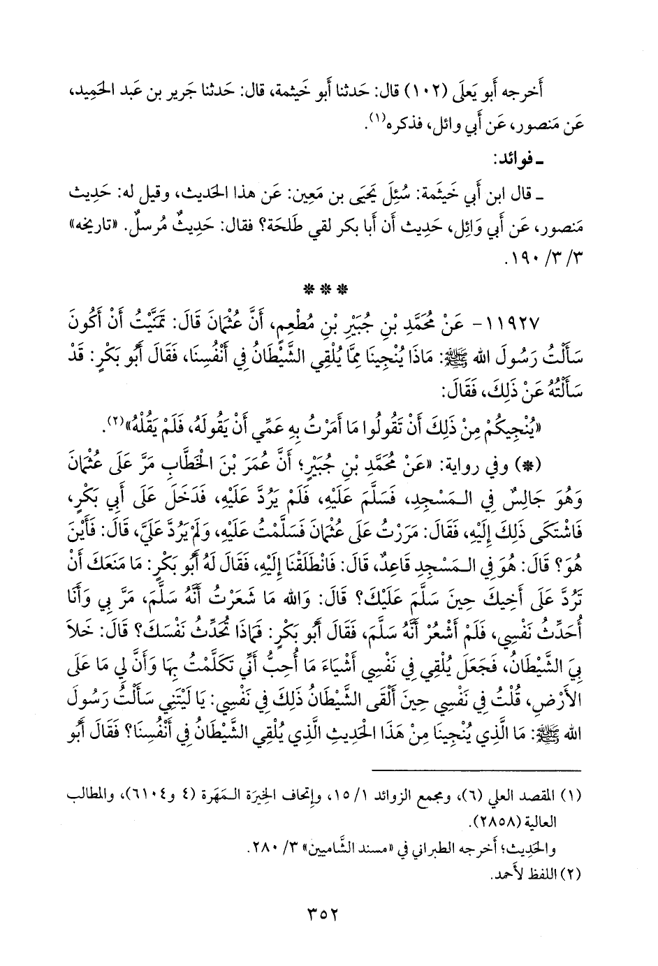 ١١٩٢٧ - عن محمد بن جبير بن مطعم، أن عثمان قال: تمنيت أن أكون سألت رسول الله صَلى الله عَليه وسَلم: ماذا ينجينا مما يلقي الشيطان في أنفسنا، فقال أَبو بكر: قد سألته عن ذلك، فقال: