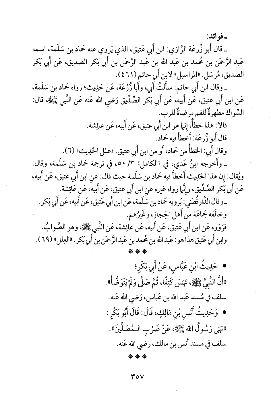 - قال أَبو زُرعَة الرازي: ابن أبي عتيق، الذي يروي عنه حماد بن سلمة، اسمه عبد الرَّحمَن بن محمد بن عبد الله بن عبد الرَّحمَن بن أَبي بكر الصِّدِّيق، عن أَبي بكر الصِّدِّيق، مرسل. «المراسيل» لابن أبي حاتم (٤٦١).