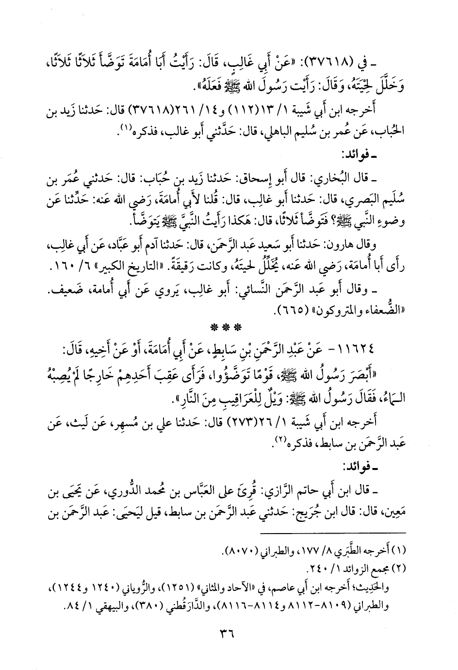 - قلنا: إِسناده ضعيفٌ؛ قال البخاري: قال أَبو إسحاق: حدثنا زيد بن حباب: قال: حدثني عمر بن سليم البصري، قال: حدثنا أَبو غالب، قال: قلنا لأَبي أُمامة، رضي الله عنه: حدثنا عن وضوء النبي صَلى الله عَليه وسَلم؟ فتوضأ ثلاثا، قال: هكذا رأيت النبي صَلى الله عَليه وسَلم يتوضأ.