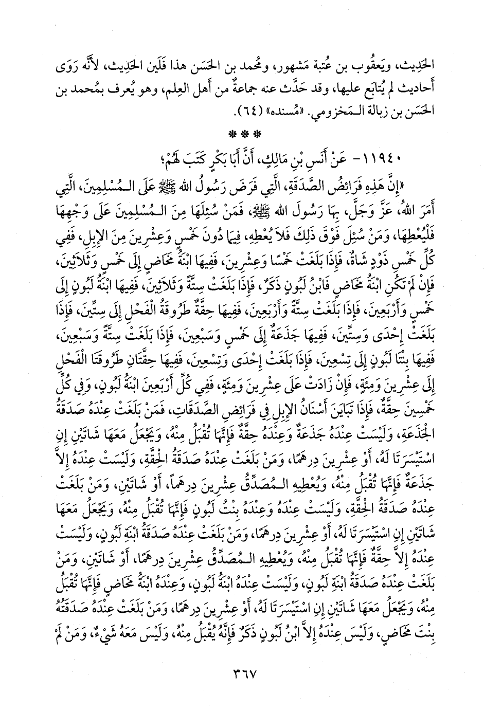 «إن هذه فرائض الصدقة، التي فرض رسول الله صَلى الله عَليه وسَلم على المسلمين، التي أمر الله، عز وجل، بها رسول الله صَلى الله عَليه وسَلم فمن سئلها من المسلمين على وجهها فليعطها، ومن سئل فوق ذلك فلا يعطه، فيما دون خمس وعشرين من الإبل، ففي كل خمس ذَوْدٍ شاة، فإذا بلغت خمسا وعشرين، ففيها ابنة مخاض إلى خمس وثلاثين، فإن لم تكن ابنة مخاض فابن لبون ذكر، فإذا بلغت ستة وثلاثين، ففيها ابنة لبون إلى خمس وأربعين، فإذا بلغت ستة وأربعين، ففيها حقة طروقة الفحل إلى ستين، فإذا بلغت إحدى وستين، ففيها جذعة إلى خمس وسبعين، فإذا بلغت ستة وسبعين، ففيها بنتا لبون إلى تسعين، فإذا بلغت إحدى وتسعين، ففيها حقتان طروقتا الفحل إلى عشرين ومئة، فإن زادت على عشرين ومئة، ففي كل أربعين ابنة لبون، وفي كل خمسين حقة، فإذا تباين أسنان الإبل في فرائض الصدقات، فمن بلغت عنده صدقة الجذعة، وليست عنده جذعة وعنده حقة فإنها تقبل منه، ويجعل معها شاتين إن استيسرتا له، أو عشرين درهما، ومن بلغت عنده صدقة الحقة، وليست عنده إلا جذعة فإنها تقبل منه، ويعطيه المصدق عشرين درهما، أو شاتين، ومن بلغت عنده صدقة الحقة، وليست عنده وعنده بنت لبون فإنها تقبل منه، ويجعل معها شاتين إن استيسرتا له، أو عشرين درهما، ومن بلغت عنده صدقة ابنة لبون، وليست عنده إلا حقة فإنها تقبل منه، ويعطيه المصدق عشرين درهما، أو شاتين، ومن بلغت عنده صدقة ابنة لبون، وليست عنده ابنة لبون، وعنده ابنة مخاض فإنها تقبل منه، ويجعل معها شاتين إن استيسرتا له، أو عشرين درهما، ومن بلغت عنده صدقته بنت مخاض، وليس عنده إلا ابن لبون ذكر فإنه يقبل منه، وليس معه شيء، ومن لم