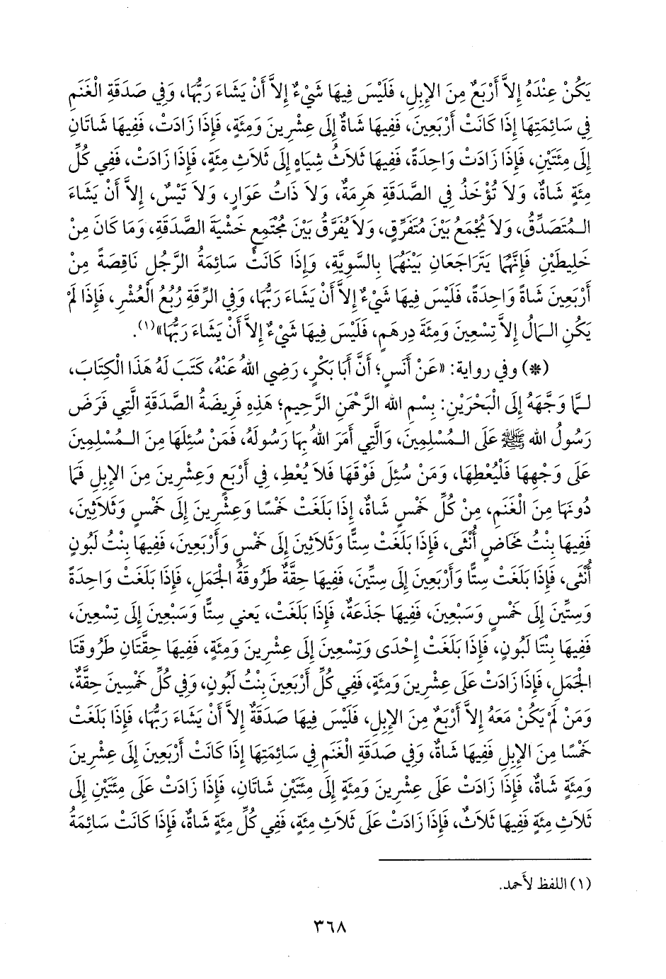 - وفي رواية: «عن أَنس؛ أن أبا بكر، رضي الله عنه، كتب له هذا الكتاب، لما وجهه إلى البحرين: بسم الله الرَّحمَن الرحيم؛ هذه فريضة الصدقة التي فرض رسول الله صَلى الله عَليه وسَلم على المسلمين، والتي أمر الله بها رسوله، فمن سئلها من المسلمين على وجهها فليعطها، ومن سئل فوقها فلا يعط، في أربع وعشرين من الإبل فما دونها من الغنم، من كل خمس شاة، إذا بلغت خمسا وعشرين إلى خمس وثلاثين، ففيها بنت مخاض أنثى، فإذا بلغت ستا وثلاثين إلى خمس وأربعين، ففيها بنت لبون أنثى، فإذا بلغت ستا وأربعين إلى ستين، ففيها حقة طروقة الجمل، فإذا بلغت واحدة وستين إلى خمس وسبعين، ففيها جذعة، فإذا بلغت، يعني ستا وسبعين إلى تسعين، ففيها بنتا لبون، فإذا بلغت إحدى وتسعين إلى عشرين ومئة، ففيها حقتان طروقتا الجمل، فإذا زادت على عشرين ومئة، ففي كل أربعين بنت لبون، وفي كل خمسين حقة، ومن لم يكن معه إلا أربع من الإبل، فليس فيها صدقة إلا أن يشاء ربها، فإذا بلغت خمسا من الإبل ففيها شاة، وفي صدقة الغنم في سائمتها إذا كانت أربعين إلى عشرين ومئة شاة، فإذا زادت على عشرين ومئة إلى مئتين شاتان، فإذا زادت على مئتين إلى ثلاث مئة ففيها ثلاث، فإذا زادت على ثلاث مئة، ففي كل مئة شاة، فإذا كانت سائمة
