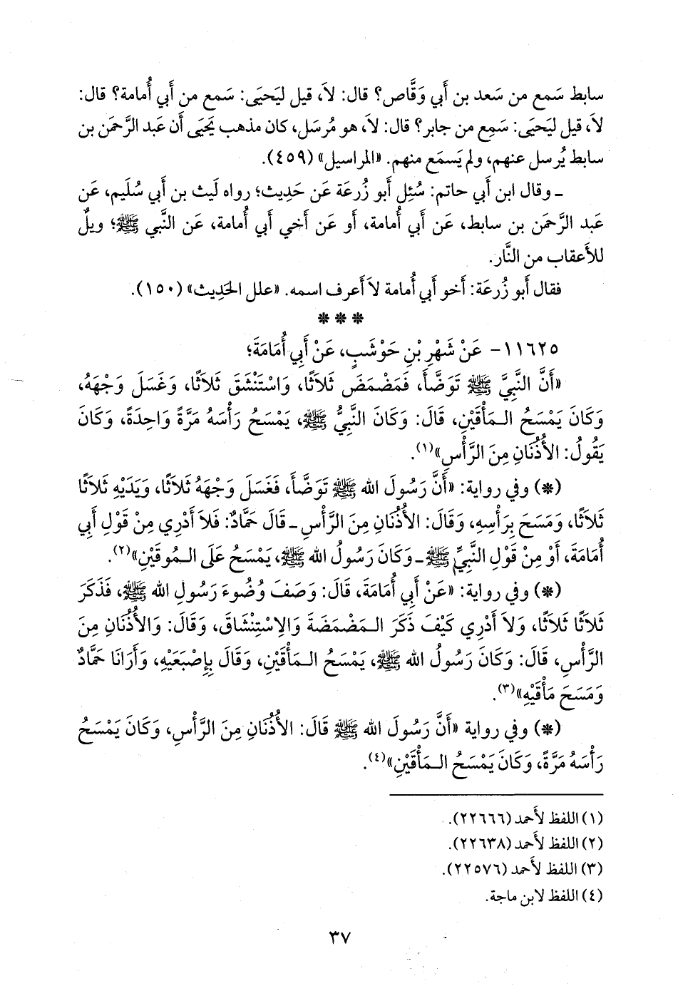 - وفي رواية: «أن رسول الله صَلى الله عَليه وسَلم توضأ، فغسل وجهه ثلاثا، ويديه ثلاثا ثلاثا، ومسح برأسه، وقال: الأذنان من الرأس ـ قال حماد: فلا أدري من قول أَبي أُمامة، أو من قول النبي صَلى الله عَليه وسَلم وكان رسول الله صَلى الله عَليه وسَلم يمسح على الموقين» (¬٢).