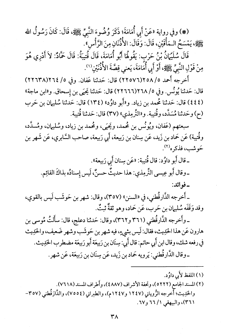 - وفي رواية: «عن أَبي أُمامة؛ ذكر وضوء النبي صَلى الله عَليه وسَلم قال: كان رسول الله صَلى الله عَليه وسَلم يمسح المأقين، قال: وقال: الأذنان من الرأس».