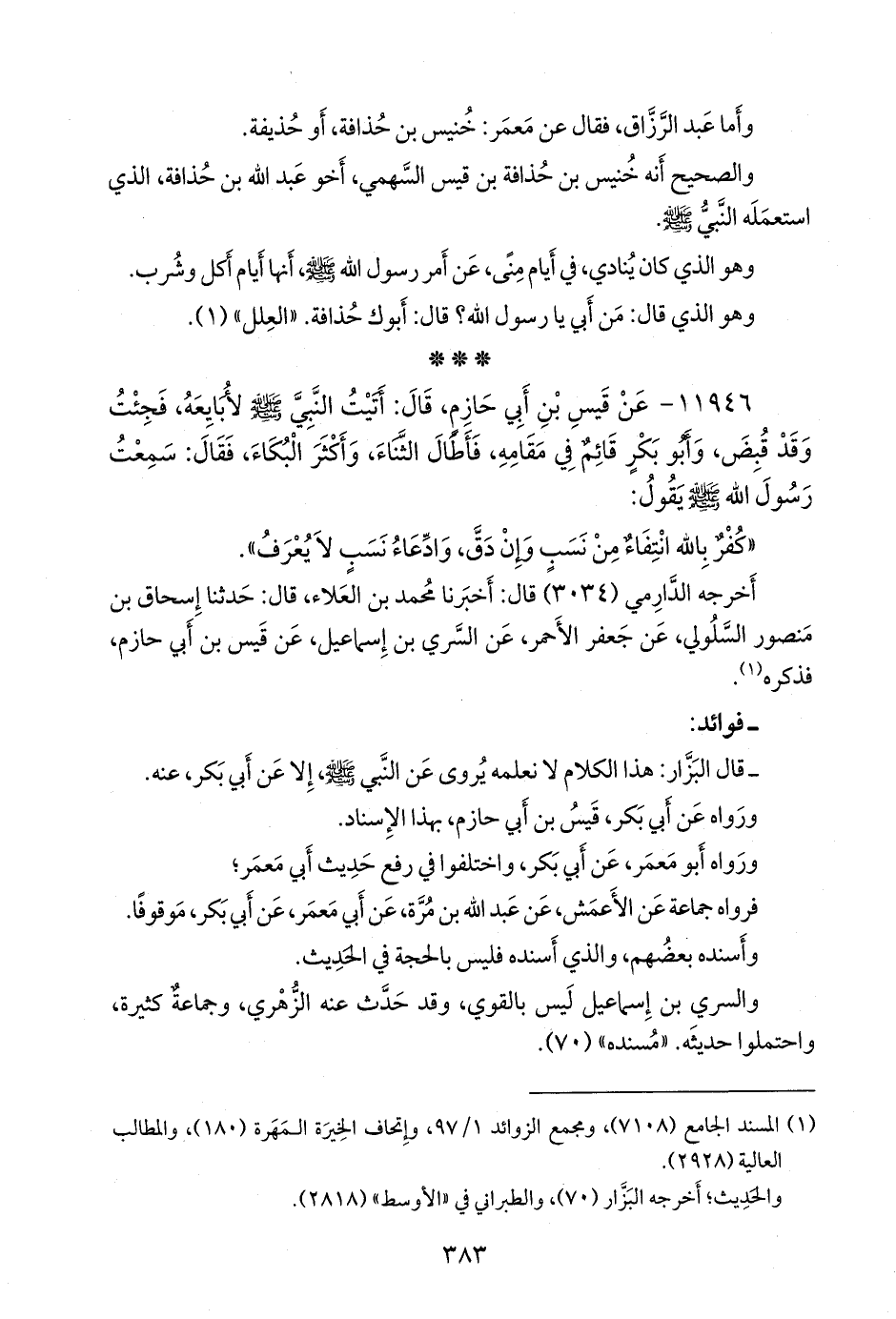 ١١٩٤٦ - عن قيس بن أبي حازم، قال: أتيت النبي صَلى الله عَليه وسَلم لأبايعه، فجئت وقد قبض، وأَبو بكر قائم في مقامه، فأطال الثناء، وأكثر البكاء، فقال: سمعت رسول الله صَلى الله عَليه وسَلم يقول:
