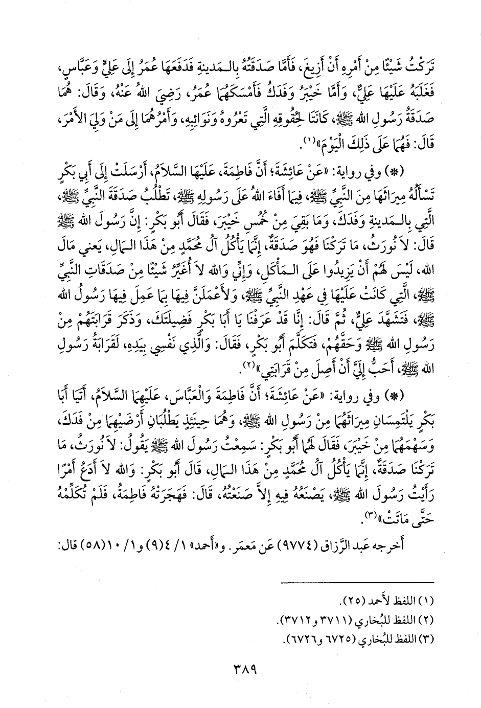 - وفي رواية: «عن عائشة؛ أن فاطمة، عليها السلام، أرسلت إلى أَبي بكر تسأله ميراثها من النبي صَلى الله عَليه وسَلم فيما أفاء الله على رسوله صَلى الله عَليه وسَلم تطلب صدقة النبي صَلى الله عَليه وسَلم التي بالمدينة وفدك، وما بقي من خمس خيبر، فقال أَبو بكر: إن رسول الله صَلى الله عَليه وسَلم قال: لا نورث، ما تركنا فهو صدقة، إنما يأكل آل محمد من هذا المال، يعني مال الله، ليس لهم أن يزيدوا على المأكل، وإني والله لا أغير شيئًا من صدقات النبي صَلى الله عَليه وسَلم التي كانت عليها في عهد النبي صَلى الله عَليه وسَلم ولأعملن فيها بما عمل فيها رسول الله صَلى الله عَليه وسَلم فتشهد علي، ثم قال: إنا قد عرفنا يا أبا بكر فضيلتك، وذكر قرابتهم من رسول الله صَلى الله عَليه وسَلم وحقهم، فتكلم أَبو بكر، فقال: والذي نفسي بيده، لقرابة رسول الله صَلى الله عَليه وسَلم أحب إلي أن أصل من قرابتي» (¬١).