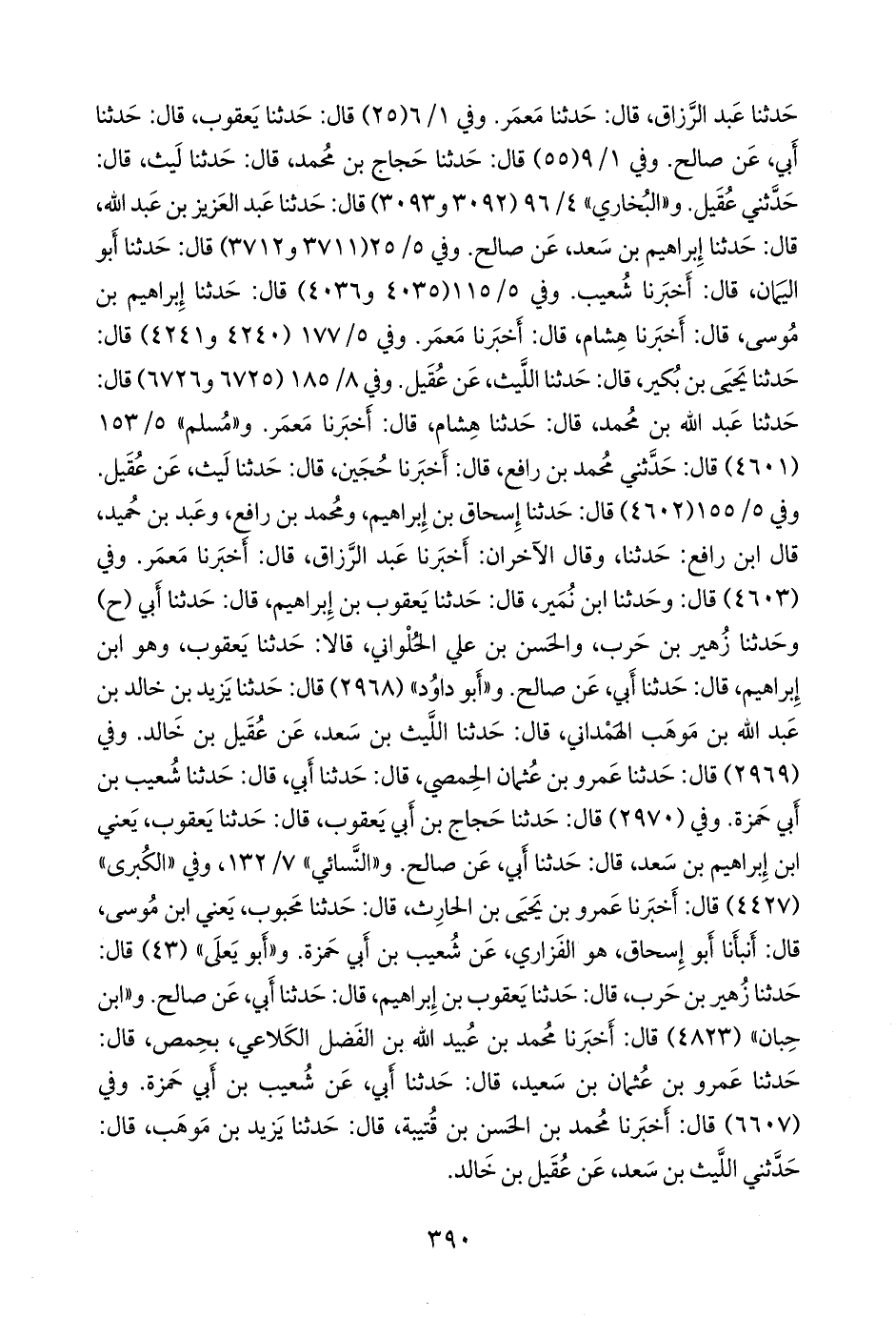 وفي ٨/ ١٨٥ (٦٧٢٥ و ٦٧٢٦) قال: حدثنا عبد الله بن محمد, قال: حدثنا هشام, قال: أخبرنا معمر. و «مسلم» ٥/ ١٥٣ (٤٦٠١) قال: حدثني محمد بن رافع, قال: أخبرنا حجين, قال: حدثنا ليث، عن عُقَيل. وفي ٥/ ١٥٥ (٤٦٠٢) قال: حدثنا إسحاق بن إبراهيم، ومحمد بن رافع، وعَبد بن حُميد، قال ابن رافع: حدثنا، وقال الآخران: أخبرنا عبد الرزاق, قال: أخبرنا معمر. وفي (٤٦٠٣) قال: وحدثنا ابن نُمير, قال: حدثنا يعقوب بن إبراهيم, قال: حدثنا أبي (ح) وحدثنا زهير بن حرب، والحسن بن علي الحُلْواني، قالا: حدثنا يعقوب، وهو ابن إبراهيم, قال: حدثنا أبي، عن صالح. و «أَبو داود» (٢٩٦٨) قال: حدثنا يزيد بن خالد بن عبد الله بن مَوهَب الهمداني, قال: حدثنا الليث بن سعد، عن عُقيل بن خالد. وفي (٢٩٦٩) قال: حدثنا عَمرو بن عثمان الحِمصي, قال: حدثنا أبي, قال: حدثنا شعيب بن أبي حمزة. وفي (٢٩٧٠) قال: حدثنا حجاج بن أبي يعقوب, قال: حدثنا يعقوب، يعني ابن إبراهيم بن سعد, قال: حدثنا أبي، عن صالح. و «النَّسَائي» ٧/ ١٣٢، وفي «الكبرى» (٤٤٢٧) قال: أخبرنا عَمرو بن يحيى بن الحارث، قال: حدثنا محبوب، يعني ابن موسى، قال: أنبأنا أَبو إسحاق، هو الفزاري، عن شعيب بن أبي حمزة. و «أَبو يَعلى» (٤٣) قال: حدثنا زهير بن حرب، قال: حدثنا يعقوب بن إبراهيم، قال: حدثنا أبي، عن صالح. و «ابن حِبَّان» (٤٨٢٣) قال: أخبرنا محمد بن عُبيد الله بن الفضل الكَلاعي، بحمص، قال: حدثنا عَمرو بن عثمان بن سعيد، قال: حدثنا أبي، عن شعيب بن أبي حمزة. وفي (٦٦٠٧) قال: أخبرنا محمد بن الحسن بن قتيبة، قال: حدثنا يزيد بن مَوهَب، قال: حدثني الليث بن سعد، عن عُقيل بن خالد.