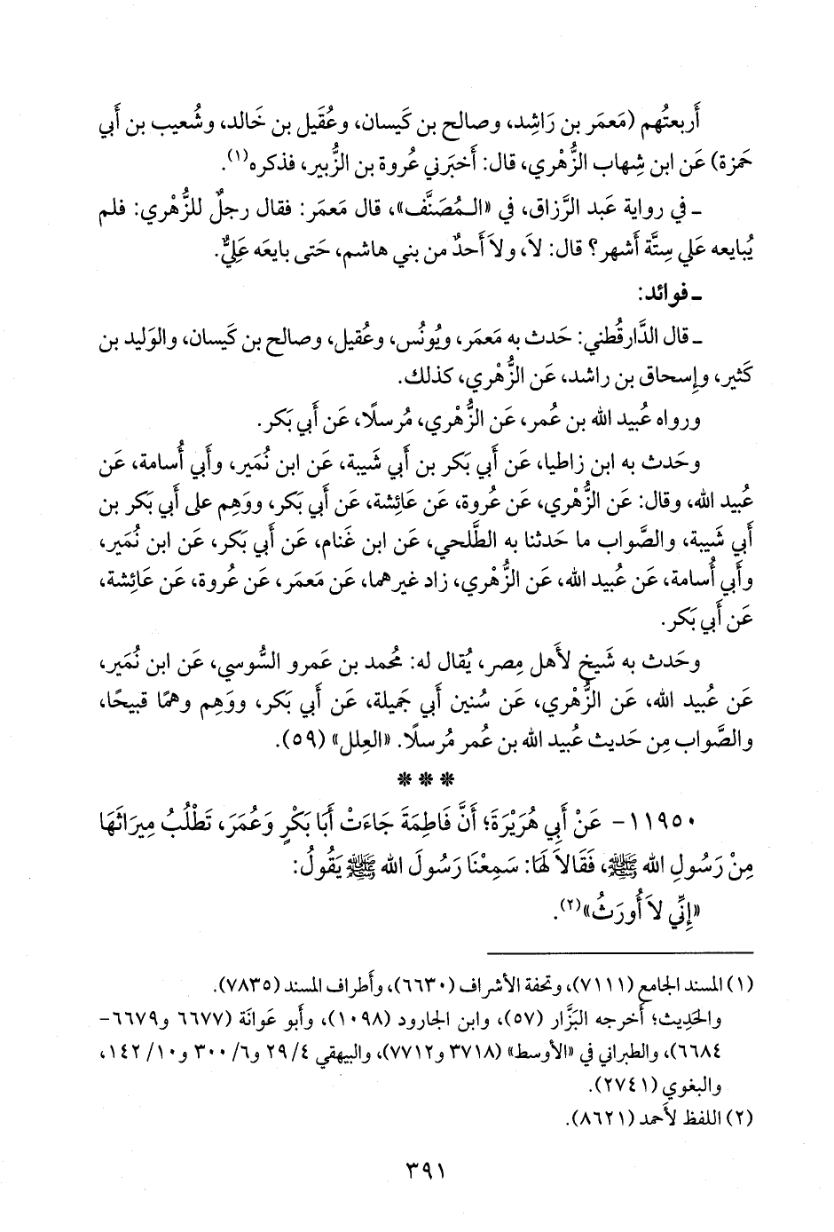 ١١٩٥٠ - عن أبي هريرة؛ أن فاطمة جاءت أبا بكر وعمر، تطلب ميراثها من رسول الله صَلى الله عَليه وسَلم فقالا لها: سمعنا رسول الله صَلى الله عَليه وسَلم يقول: