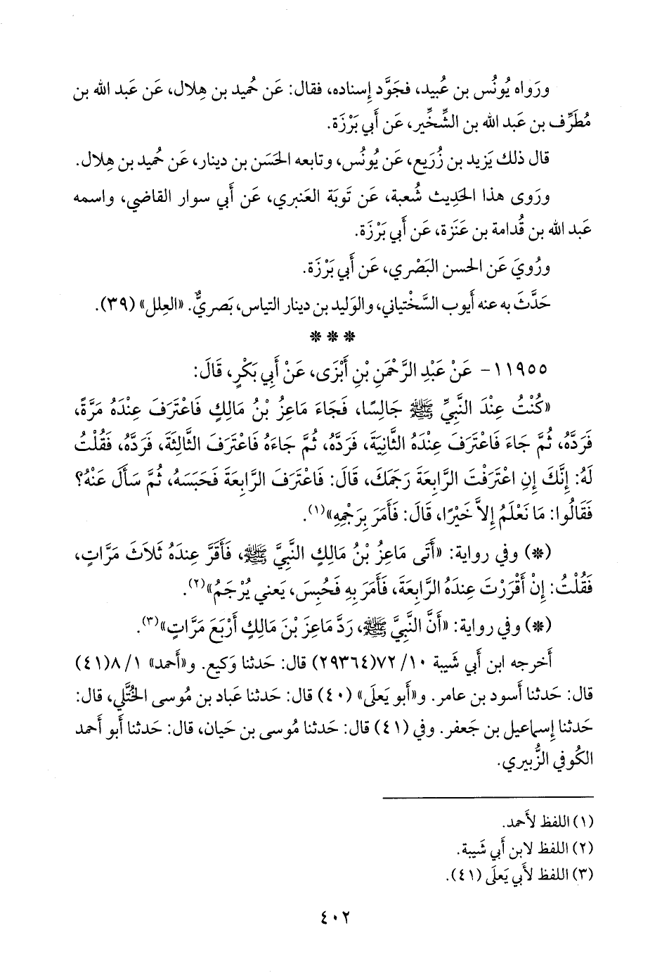 «شهد ماعز على نفسه أربع مرات، أنه قد زنى، فأمر به رسول الله صَلى الله عَليه وسَلم أن يرجم». «مُرسَل».