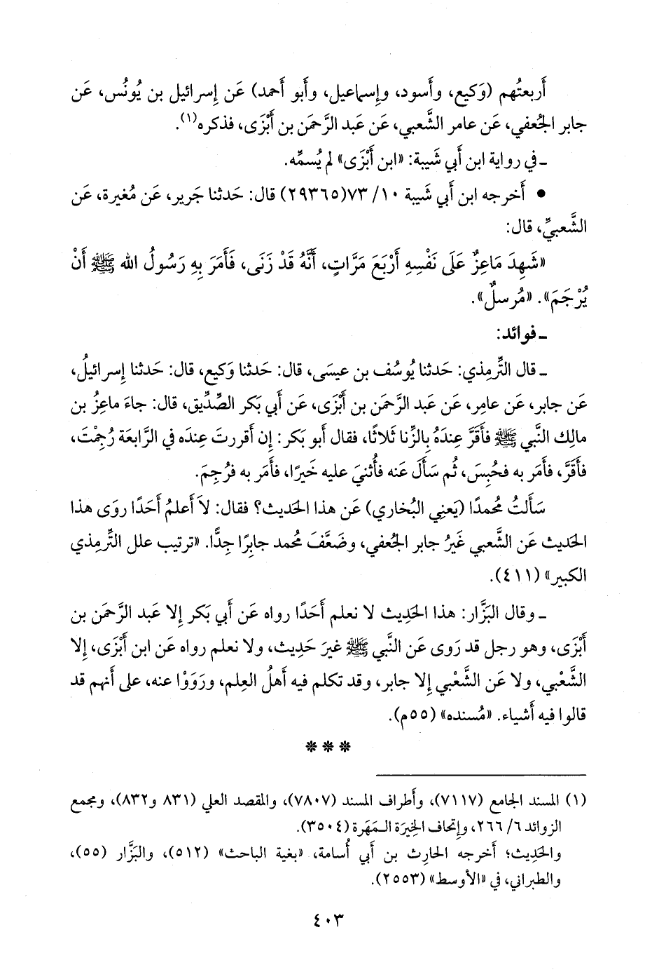 - وقال التِّرمِذي: حدثنا يوسف بن عيسى، قال: حدثنا وكيع، قال: حدثنا إسرائيل، عن جابر، عن عامر، عن عبد الرَّحمَن بن أبزى، عن أَبي بكر الصِّدِّيق، قال: جاء ماعز بن مالك النبي صَلى الله عَليه وسَلم فأقر عنده بالزنا ثلاثا، فقال أَبو بكر: إن أقررت عنده في الرابعة رجمت، فأقر، فأمر به فحبس، ثم سأل عنه فأثني عليه خيرا، فأمر به فرجم.