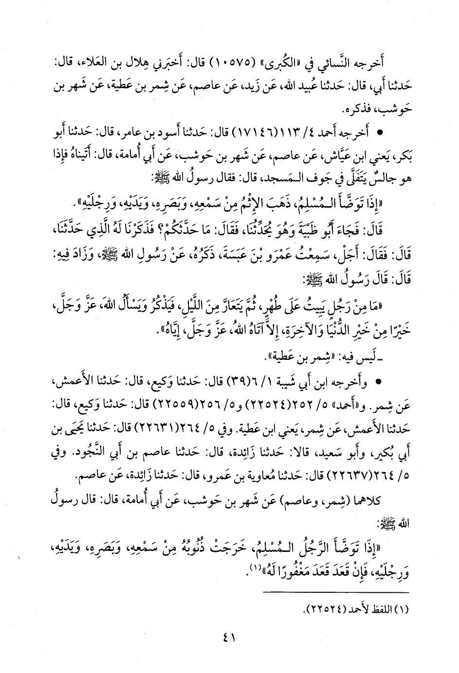- وفي رواية: «عن أَبي أُمامة، قال: لو لم أسمعه من النبي صَلى الله عَليه وسَلم إلا سبع مرار، ما حدثت به، قال: إذا توضأ الرجل كما أمر، ذهب الإثم من سمعه، وبصره، ويديه، ورجليه» (¬٢).
