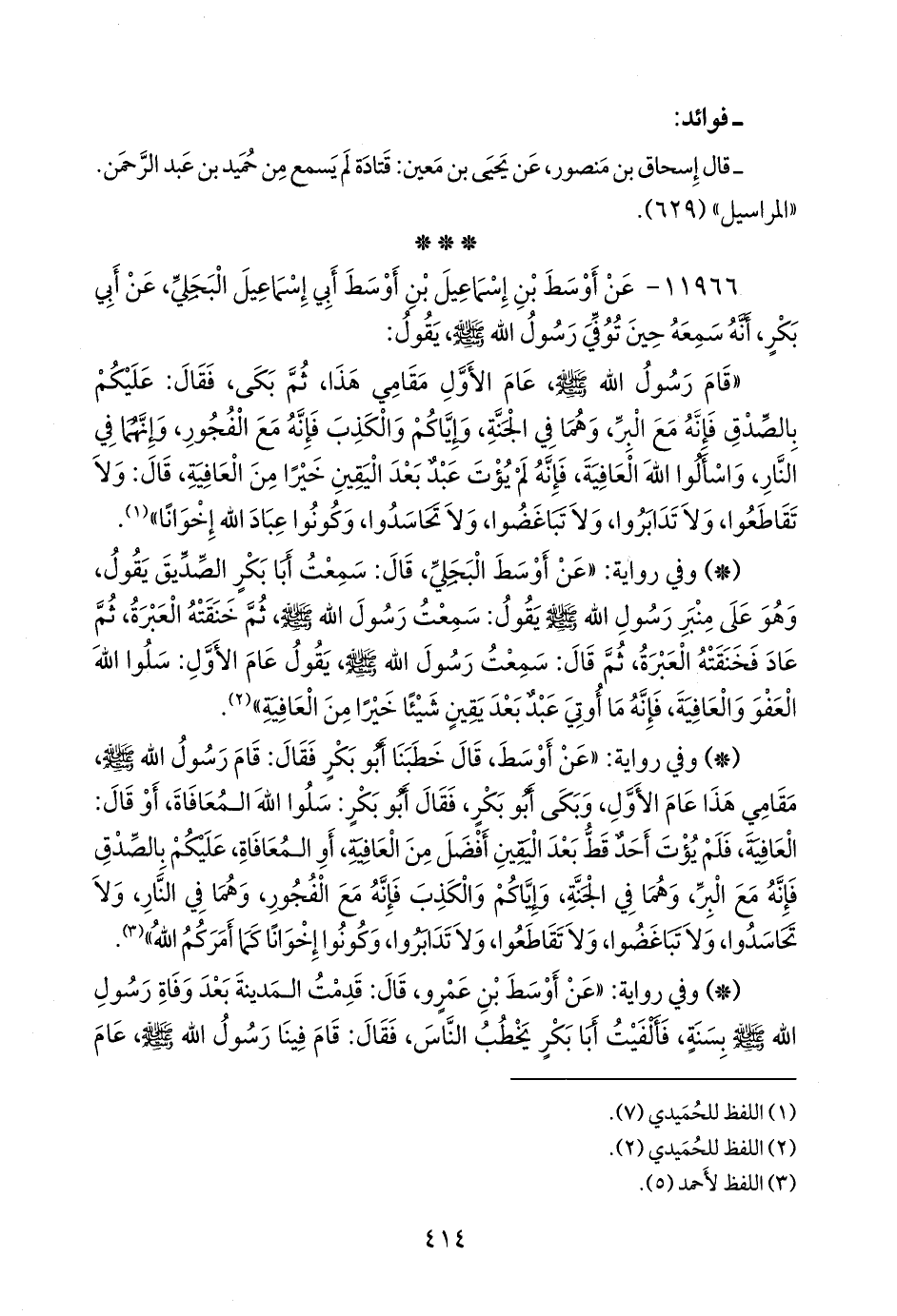 - وفي رواية: «عن أوسط، قال خطبنا أَبو بكر فقال: قام رسول الله صَلى الله عَليه وسَلم مقامي هذا عام الأول، وبكى أَبو بكر، فقال أَبو بكر: سلوا الله المعافاة، أو قال: العافية، فلم يؤت أحد قط بعد اليقين أفضل من العافية، أو المعافاة، عليكم بالصدق فإنه مع البر، وهما في الجنة، وإياكم والكذب فإنه مع الفجور، وهما في النار، ولا تحاسدوا، ولا تباغضوا، ولا تقاطعوا، ولا تدابروا، وكونوا إخوانا كما أمركم الله» (¬٣).