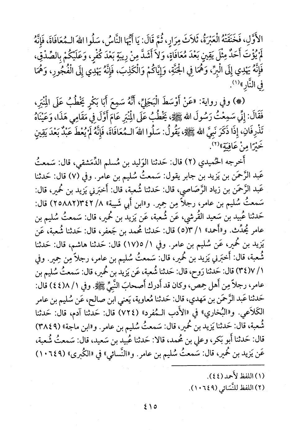 قال: أخبرنا أَبو داود، قال: حدثنا محمد بن سليمان، قال: حدثنا عيسى بن أبي رَزين الثمالي الحِمصي، عن لقمان بن عامر. وفي (١٠٦٥٠) قال: أخبرنا يحيى بن عثمان، قال: أخبرنا عمر بن عبد الواحد، قال: حدثنا عبد الرَّحمَن بن يزيد بن جابر، قال: حدثني سليم بن عامر. وفي (١٠٦٥١) قال: أخبرني محمود بن خالد، قال: حدثنا الوليد، قال: حدثنا ابن جابر، قال: حدثني سليم بن عامر. وفي (١٠٦٥٢) قال: أخبرنا علي بن الحسين، قال: حدثنا أُمَية بن خالد، عن شعبة، عن يزيد بن خمير، عن سليم بن عامر.