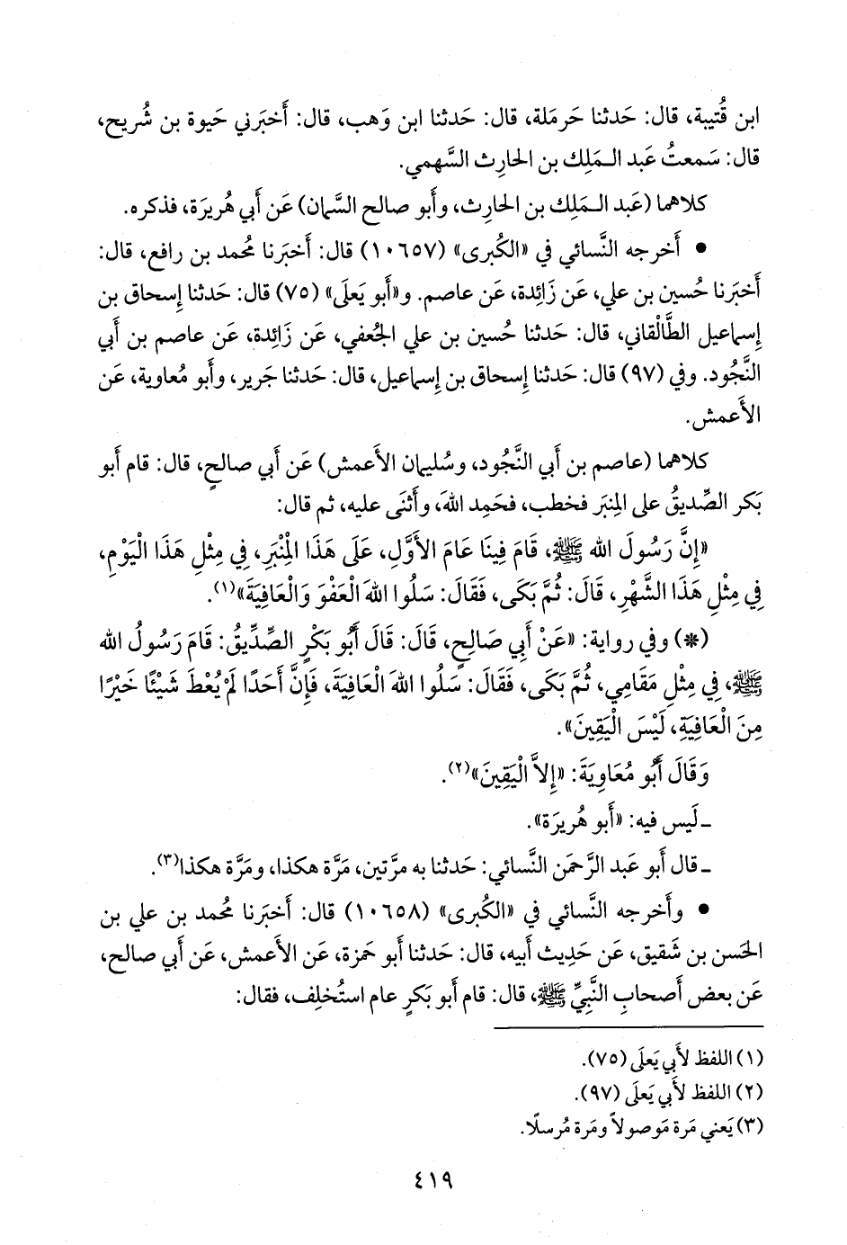 - وفي رواية: «عن أبي صالح، قال: قال أَبو بكر الصِّدِّيق: قام رسول الله صَلى الله عَليه وسَلم في مثل مقامي، ثم بكى، فقال: سلوا الله العافية، فإن أحدا لم يعط شيئًا خيرًا من العافية، ليس اليقين».