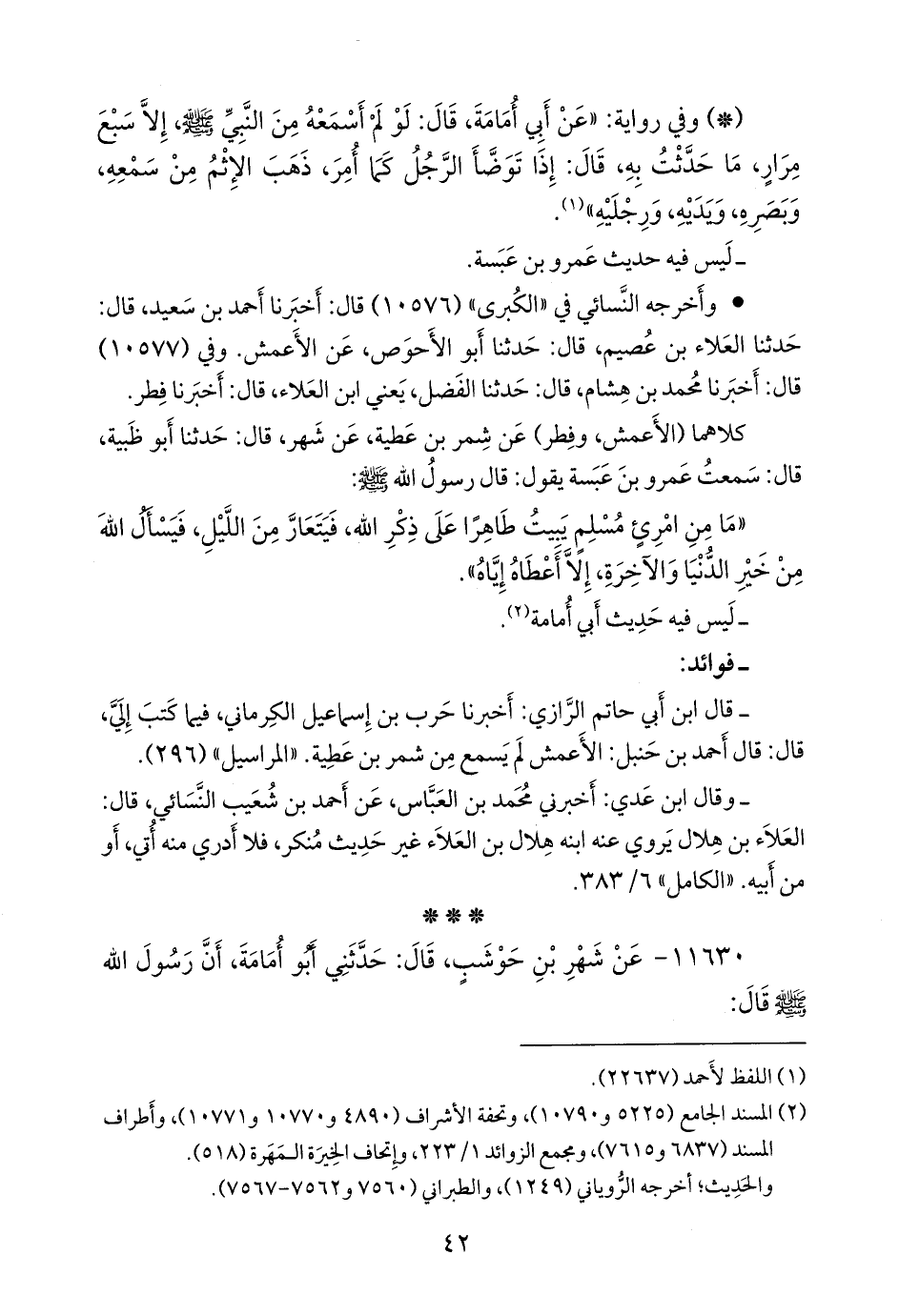 (¬١) المسند الجامع (٥٢٢٥ و ١٠٧٩٠)، وتحفة الأشراف (٤٨٩٠ و ١٠٧٧٠ و ١٠٧٧١)، وأطراف المسند (٦٨٣٧ و ٧٦١٥)، ومَجمَع الزوائد ١/ ٢٢٣، وإتحاف الخِيرَة المَهَرة (٥١٨).
