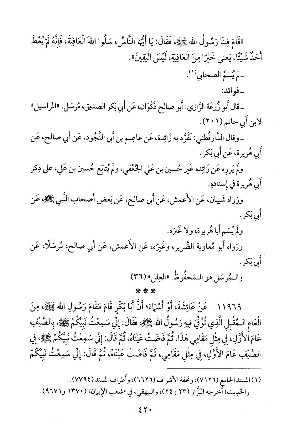 - وقال الدارقُطني: تفرد به زائدة، عن عاصم بن أبي النجود، عن أبي صالح، عن أبي هريرة، عن أَبي بكر.