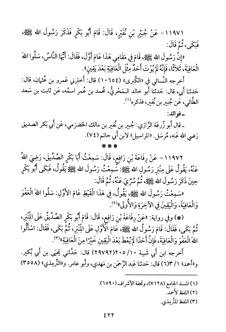 - وفي رواية: «عن رفاعة بن رافع، قال: قام أَبو بكر الصِّدِّيق على المنبر، ثم بكى، فقال: قام رسول الله صَلى الله عَليه وسَلم عام الأول على المنبر، ثم بكى، فقال: اسألوا الله العفو والعافية، فإن أحدا لم يعط بعد اليقين خيرًا من العافية» (¬٢).