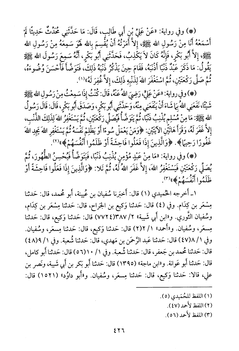 ١ - أخرجه الحُميدي (١) قال: أخبرنا سفيان بن عُيينة، أَبو محمد, قال: حدثنا مِسعَر بن كِدَام. وفي (٤) قال: حدثنا وكيع بن الجراح, قال: حدثنا مِسعَر بن كِدَام، وسفيان الثوري. و «ابن أبي شيبة» (٧٧٢٤) قال: حدثنا وكيع, قال: حدثنا مسعر، وسفيان. و «أحمد» (٢) قال: حدثنا وكيع، قال: حدثنا مسعر، وسفيان. وفي ١/ ٨ (٤٧) قال: حدثنا عبد الرَّحمَن بن مهدي, قال: حدثنا شعبة. وفي ١/ ٩ (٤٨) قال: حدثنا محمد بن جعفر, قال: حدثنا شعبة. وفي ١/ ١٠ (٥٦) قال: حدثنا أَبو كامل, قال: حدثنا أَبو عَوانة. و «ابن ماجة» (١٣٩٥) قال: حدثنا أَبو بكر بن أبي شيبة، ونصر بن علي، قالا: حدثنا وكيع, قال: حدثنا مسعر، وسفيان. و «أَبو داود» (١٥٢١) قال: