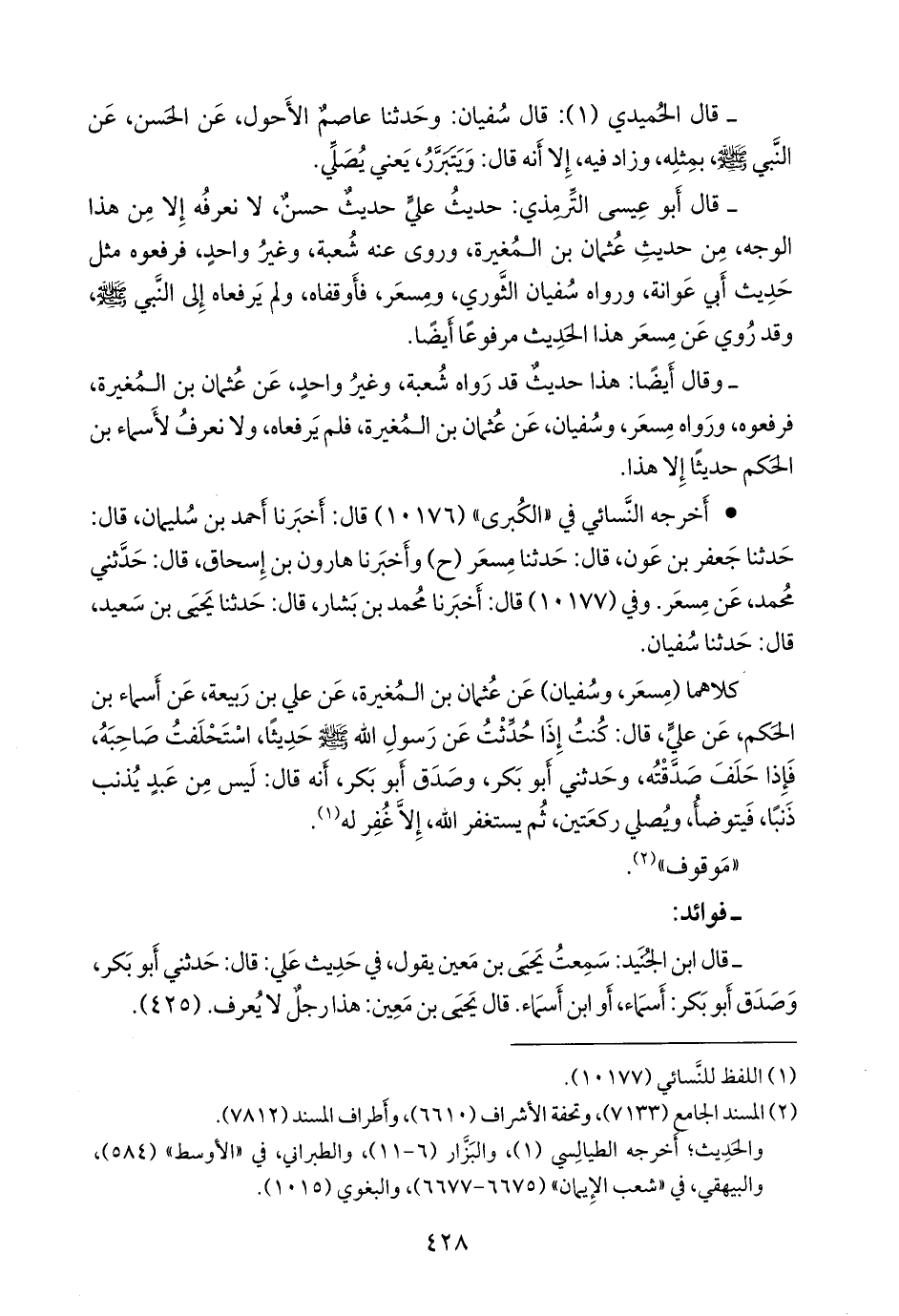 كلاهما (مسعر، وسفيان) عن عثمان بن المغيرة، عن علي بن ربيعة، عن أسماء بن الحكم، عن علي، قال: كنت إذا حدثت عن رسول الله صَلى الله عَليه وسَلم حديثا، استحلفت صاحبه، فإذا حلف صدقته، وحدثني أَبو بكر، وصدق أَبو بكر، أنه قال: ليس من عبد يذنب ذنبا، فيتوضأ، ويصلي ركعتين، ثم يستغفر الله، إلا غفر له (¬١).