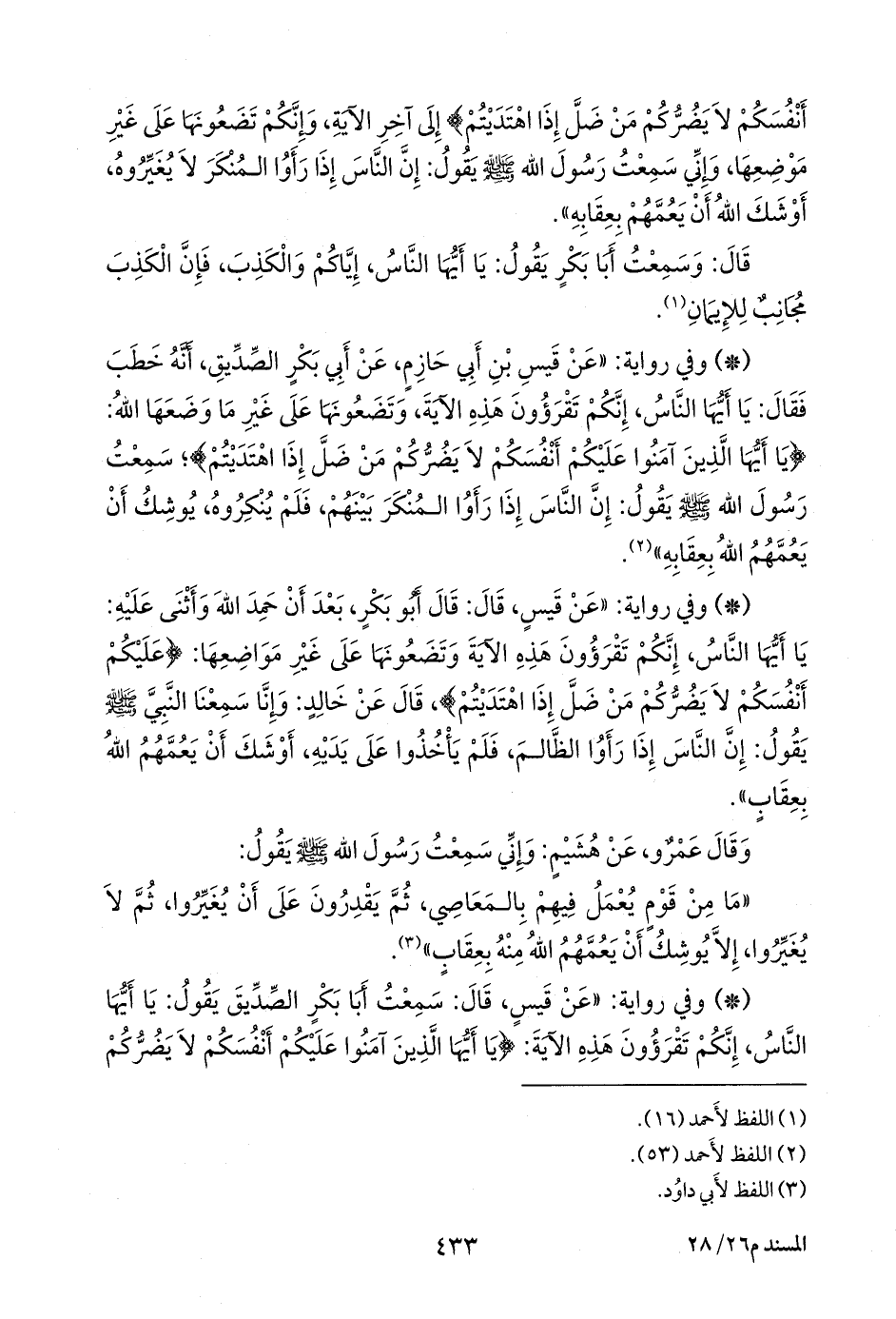 - وفي رواية: «عن أَبي بكر الصِّدِّيق، عن النبي صَلى الله عَليه وسَلم قال: يا أيها الناس، إنكم تقرؤون هذه الآية، وتضعونها على غير ما وضعها الله: {يا أيها الذين آمنوا عليكم أنفسكم لا يضركم من ضل إذا اهتديتم}؛ إن الناس إذا رأوا المنكر فلم يغيروه، يوشك أن يعمهم الله بعقاب» (¬٣).