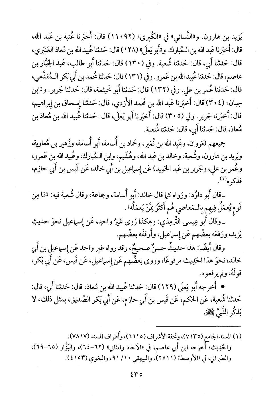 جميعهم (مروان، وعبد الله بن نُمير، وحماد بن أُسامة، أَبو أُسامة، وزهير بن معاوية، ويزيد بن هارون، وشعبة، وخالد بن عبد الله، وهُشيم، وابن المبارك، وعُبيد الله بن عَمرو، وعمر بن علي، وجرير بن عبد الحميد) عن إسماعيل بن أبي خالد، عن قيس بن أبي حازم، فذكره (¬١).