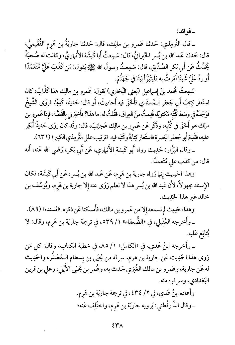 - قال التِّرمِذي: حدثنا عَمرو بن مالك، قال: حدثنا جارية بن هَرِم الفُقَيمي، قال: حدثنا عبد الله بن بُسر الحُبراني، قال: سمعتُ أَبا كَبشة الأَنماري، وكانت له صُحبة يُحَدِّث عن أَبي بكر الصِّدِّيق، قال: سمعتُ رسول الله صَلى الله عَليه وسَلم يقول: من كذب علي مُتعمدًا، أَو ردَّ علي شيئًا أَمرتُ به، فليتبوأ بيتًا في جهنم.