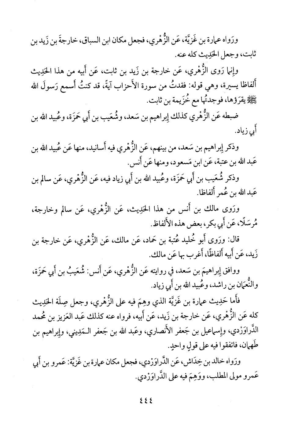 فأما حديث عمارة بن غَزِيَّة الذي وهم فيه على الزُّهْري، وجعل صلة الحديث كله عن الزُّهْري، عن خارجة بن زيد، عن أبيه، فرواه عنه كذلك عبد العزيز بن محمد الدراوَرْدي، وإسماعيل بن جعفر الأَنصاري، وعبد الله بن جعفر المديني، وإبراهيم بن طهمان، فاتفقوا فيه على قول واحد.