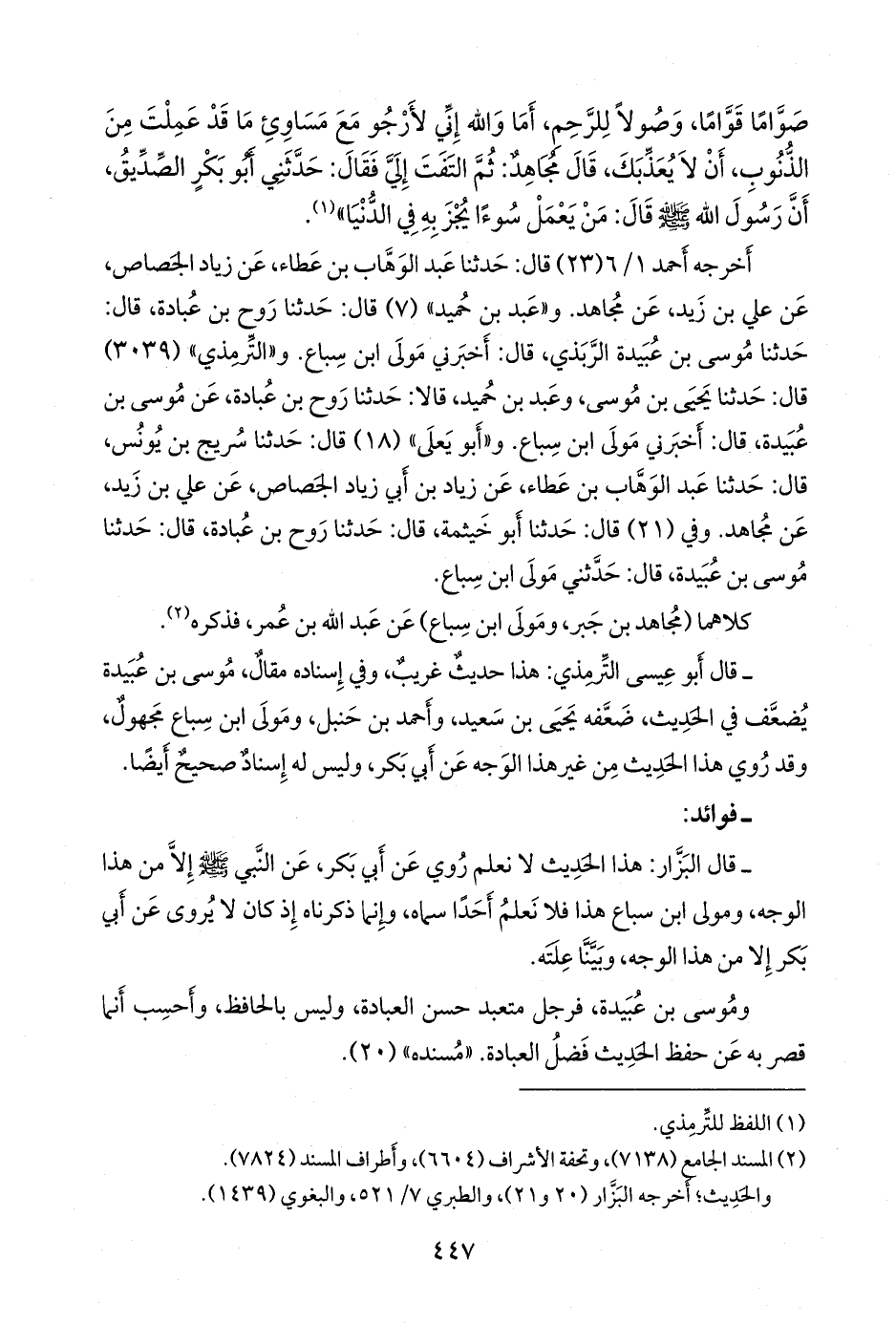 - قلنا: إسناده ضعيفٌ؛ قال البزار: هذا الحديث لا نعلم رُوي عن أَبي بكر، عن النبي صَلى الله عَليه وسَلم إِلا من هذا الوجه، ومولى ابن سباع هذا فلا نَعلمُ أَحَدًا سَمَّاه، وإِنما ذكرناه إِذ كان لا يُروى عن أَبي بكر إِلا من هذا الوجه، وبَيَّنا عِلتَه.