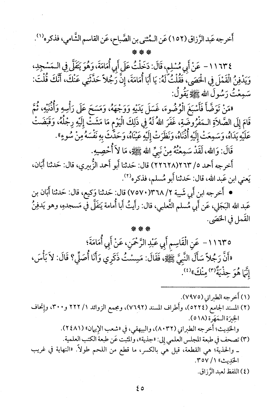 ١١٦٣٤ - عن أبي مسلم، قال: دخلت على أَبي أُمامة، وهو يتفلى في المسجد، ويدفن القمل في الحصى، فقلت له: يا أَبا أُمامة، إن رجلا حدثني عنك، أنك قلت: سمعت رسول الله صَلى الله عَليه وسَلم يقول: