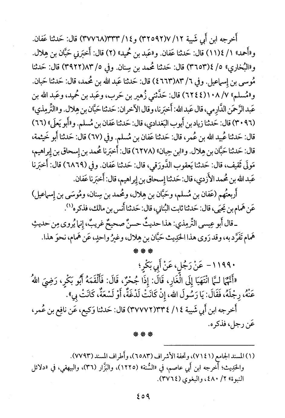 وفي ٥/ ٨٣ (٣٩٢٢) قال: حدثنا موسى بن إسماعيل. وفي ٦/ ٨٣ (٤٦٦٣) قال: حدثنا عبد الله بن محمد, قال: حدثنا حبان. و «مسلم» ٧/ ١٠٨ (٦٢٤٤) قال: حدثني زهير بن حرب، وعَبد بن حُميد، وعبد الله بن عبد الرَّحمَن الدَّارِمي، قال عبد الله: أخبرنا، وقال الآخران: حدثنا حَبَّان بن هلال. و «التِّرمِذي» (٣٠٩٦) قال: حدثنا زياد بن أيوب البغدادي, قال: حدثنا عفان بن مسلم. و «أَبو يَعلى» (٦٦) قال: حدثنا عُبيد الله بن عمر، قال: حدثنا عفان بن مسلم. وفي (٦٧) قال: حدثنا أَبو خيثمة، قال: حدثنا حَبَّان بن هلال. و «ابن حِبَّان» (٦٢٧٨) قال: أخبرنا محمد بن إسحاق بن إبراهيم مولى ثقيف، قال: حدثنا يعقوب الدورقي، قال: حدثنا عفان. وفي (٦٨٦٩) قال: أخبرنا عبد الله بن محمد الأزدي، قال: حدثنا إسحاق بن إبراهيم, قال: أخبرنا عفان.