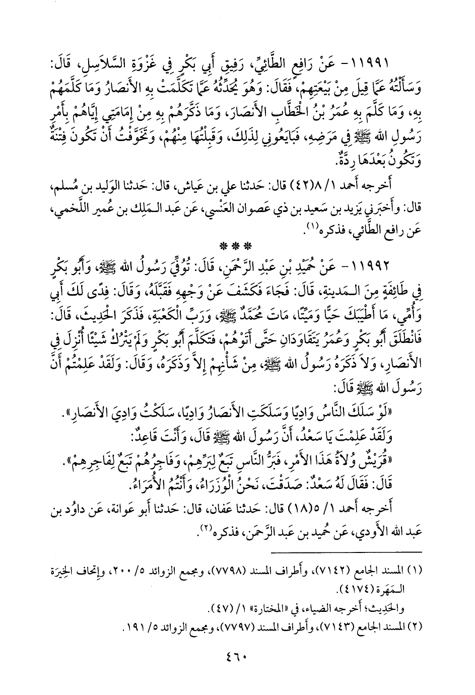 ١١٩٩٢ - عن حميد بن عبد الرَّحمَن، قال: توفي رسول الله صَلى الله عَليه وسَلم وأَبو بكر في طائفة من المدينة، قال: فجاء فكشف عن وجهه فقبله، وقال: فدى لك أبي وأمي، ما أطيبك حيا وميتا، مات محمد صَلى الله عَليه وسَلم ورب الكعبة، فذكر الحديث، قال: فانطلق أَبو بكر وعمر يتقاودان حتى أتوهم، فتكلم أَبو بكر ولم يترك شيئًا أنزل في الأنصار، ولا ذكره رسول الله صَلى الله عَليه وسَلم من شأنهم إلا وذكره، وقال: ولقد علمتم أن رسول الله صَلى الله عَليه وسَلم قال: