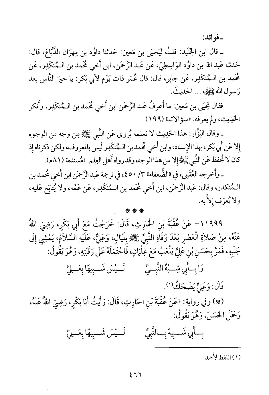 ١١٩٩٩ - عن عقبة بن الحارث، قال: خرجت مع أَبي بكر، رضي الله عنه، من صلاة العصر بعد وفاة النبي صَلى الله عَليه وسَلم بليال، وعلي، عليه السلام، يمشي إلى جنبه، فمر بحسن بن علي يلعب مع غِلمان، فاحتمله على رقبته، وهو يقول: