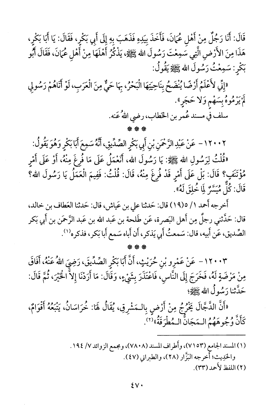 ١٢٠٠٣ - عن عَمرو بن حريث، أن أبا بكر الصِّدِّيق، رضي الله عنه، أفاق من مرضة له، فخرج إلى الناس، فاعتذر بشيء، وقال: ما أردنا إلا الخير، ثم قال: حدثنا رسول الله صَلى الله عَليه وسَلم؛