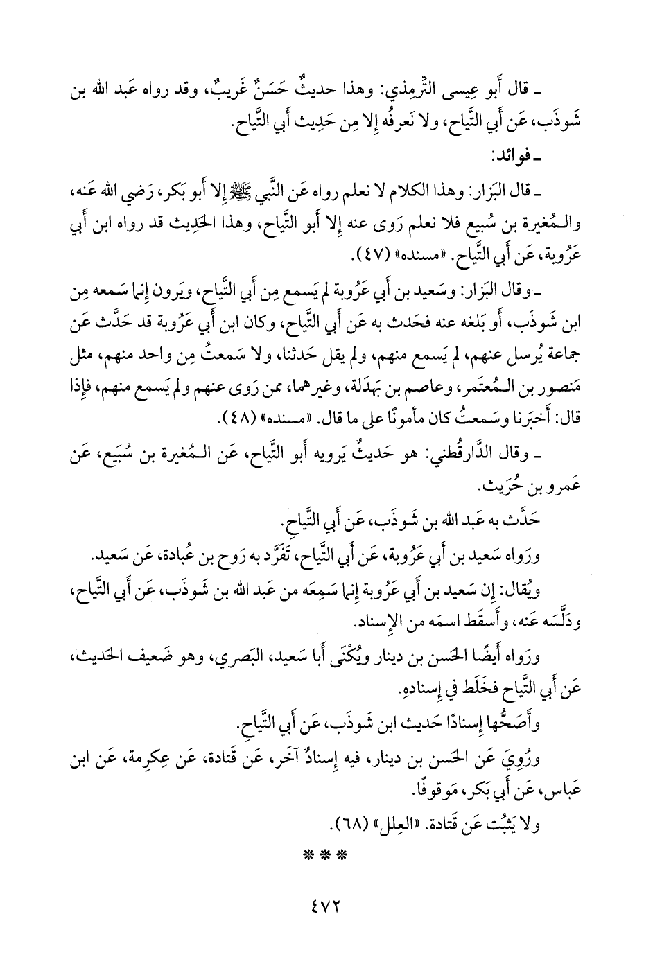 - وقال البزار: وسعيد بن أبي عَروبَة لم يسمع من أبي التياح، ويرون إنما سمعه من ابن شوذب، أو بلغه عنه فحدث به عن أبي التياح، وكان ابن أبي عَروبَة قد حدث عن جماعة يرسل عنهم، لم يسمع منهم، ولم يقل حدثنا، ولا سمعت من واحد منهم، مثل منصور بن المُعتَمِر، وعاصم بن بهدلة، وغيرهما، ممن روى عنهم ولم يسمع منهم، فإذا قال: أخبرنا وسمعت كان مأمونا على ما قال. «مسنده» (٤٨).