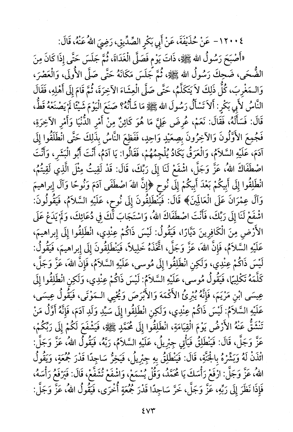 «أصبح رسول الله صَلى الله عَليه وسَلم ذات يوم فصلى الغداة، ثم جلس حتى إذا كان من الضحى، ضحك رسول الله صَلى الله عَليه وسَلم ثم جلس مكانه حتى صلى الأولى، والعصر، والمغرب، كل ذلك لا يتكلم، حتى صلى العشاء الآخرة، ثم قام إلى أهله، فقال الناس لأَبي بكر: ألا تسأل رسول الله صَلى الله عَليه وسَلم ما شأنه؟ صنع اليوم شيئًا لم يصنعه قط، قال: فسأله، فقال: نعم، عرض علي ما هو كائن من أمر الدنيا وأمر الآخرة، فجمع الأولون والآخرون بصعيد واحد، ففظع الناس بذلك حتى انطلقوا إلى آدم، عليه السلام، والعرق يكاد يلجمهم، فقالوا: يا آدم، أنت أَبو البشر، وأنت اصطفاك الله، عز وجل، اشفع لنا إلى ربك، قال: قد لقيت مثل الذي لقيتم، انطلقوا إلى أبيكم بعد أبيكم إلى نوح {إن الله اصطفى آدم ونوحا وآل إبراهيم وآل عمران على العالمين} قال: فينطلقون إلى نوح، عليه السلام، فيقولون: اشفع لنا إلى ربك، فأنت اصطفاك الله، واستجاب لك في دعائك، ولم يدع على الأرض من الكافرين ديارا، فيقول: ليس ذاكم عندي، انطلقوا إلى إبراهيم، عليه السلام، فإن الله، عز وجل، اتخذه خليلا، فينطلقون إلى إبراهيم، فيقول: ليس ذاكم عندي، ولكن انطلقوا إلى موسى، عليه السلام، فإن الله، عز وجل، كلمه تكليما، فيقول موسى، عليه السلام: ليس ذاكم عندي، ولكن انطلقوا إلى عيسى ابن مريم، فإنه يبرئ الأكمه والأبرص ويحيي الموتى، فيقول عيسى، عليه السلام: ليس ذاكم عندي، ولكن انطلقوا إلى سيد ولد آدم، فإنه أول من تنشق عنه الأرض يوم القيامة، انطلقوا إلى محمد صَلى الله عَليه وسَلم فيشفع لكم إلى ربكم، عز وجل، قال: فينطلق فيأتي جبريل، عليه السلام، ربه، فيقول الله، عز وجل: ائذن له وبشره بالجنة، قال: فينطلق به جبريل، فيخر ساجدا قدر جمعة، ويقول الله، عز وجل: ارفع رأسك يا محمد، وقل يسمع، واشفع تشفع،