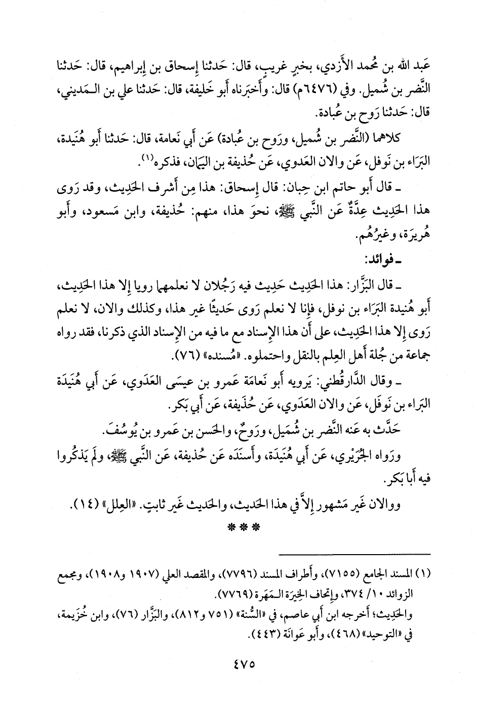 - قال البزار: هذا الحديث حديث فيه رجلان لا نعلمهما رويا إلا هذا الحديث، أَبو هنيدة البراء بن نوفل، فإنا لا نعلم روى حديثا غير هذا، وكذلك والان، لا نعلم روى إلا هذا الحديث، على أن هذا الإسناد مع ما فيه من الإسناد الذي ذكرنا، فقد رواه جماعة من جلة أهل العلم بالنقل واحتملوه. «مسنده» (٧٦).
