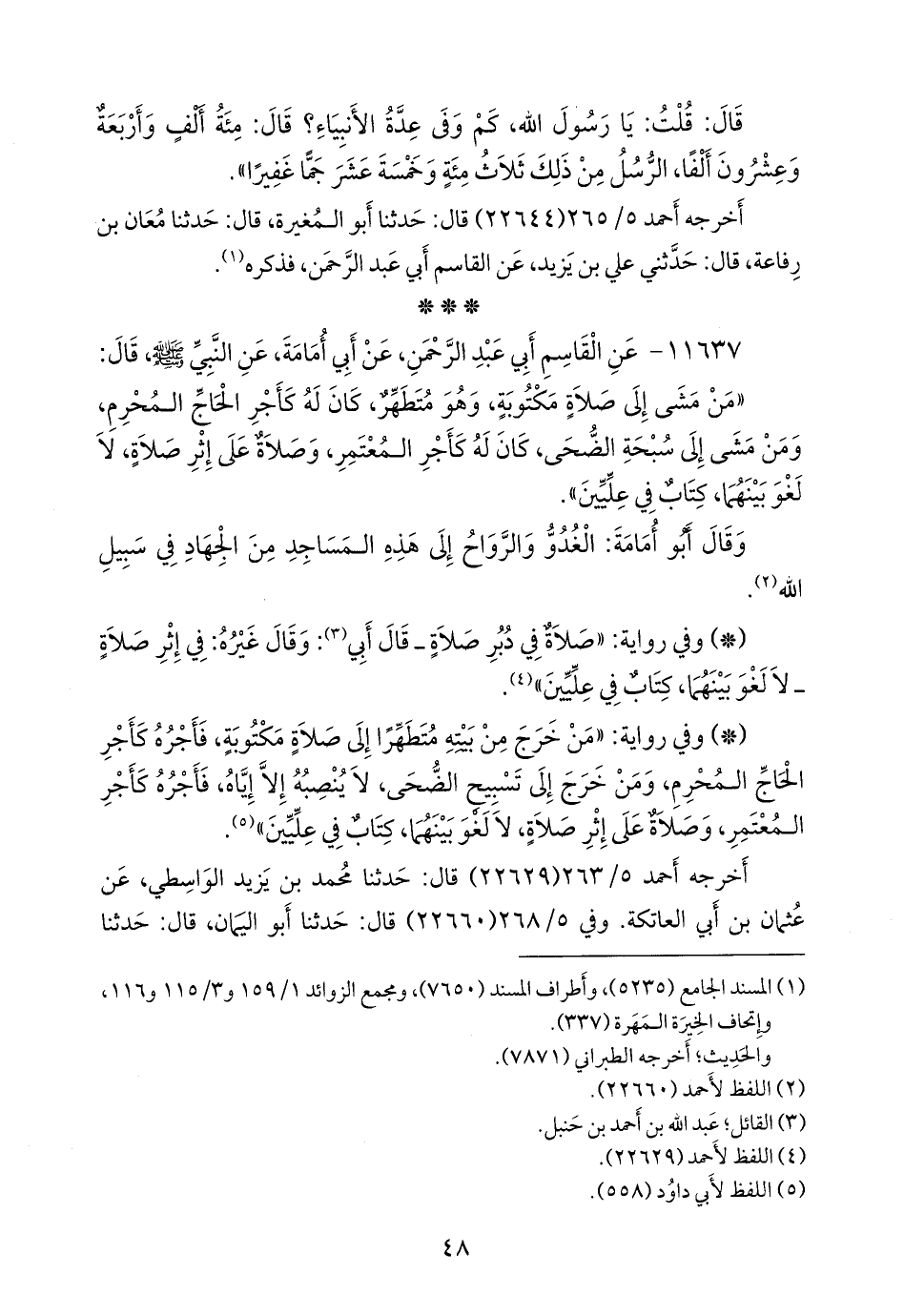 «من مشى إلى صلاة مكتوبة، وهو متطهر، كان له كأجر الحاج المحرم، ومن مشى إلى سبحة الضحى، كان له كأجر المُعتَمِر، وصلاة على إثر صلاة، لا لغو بينهما، كتاب في عليين».