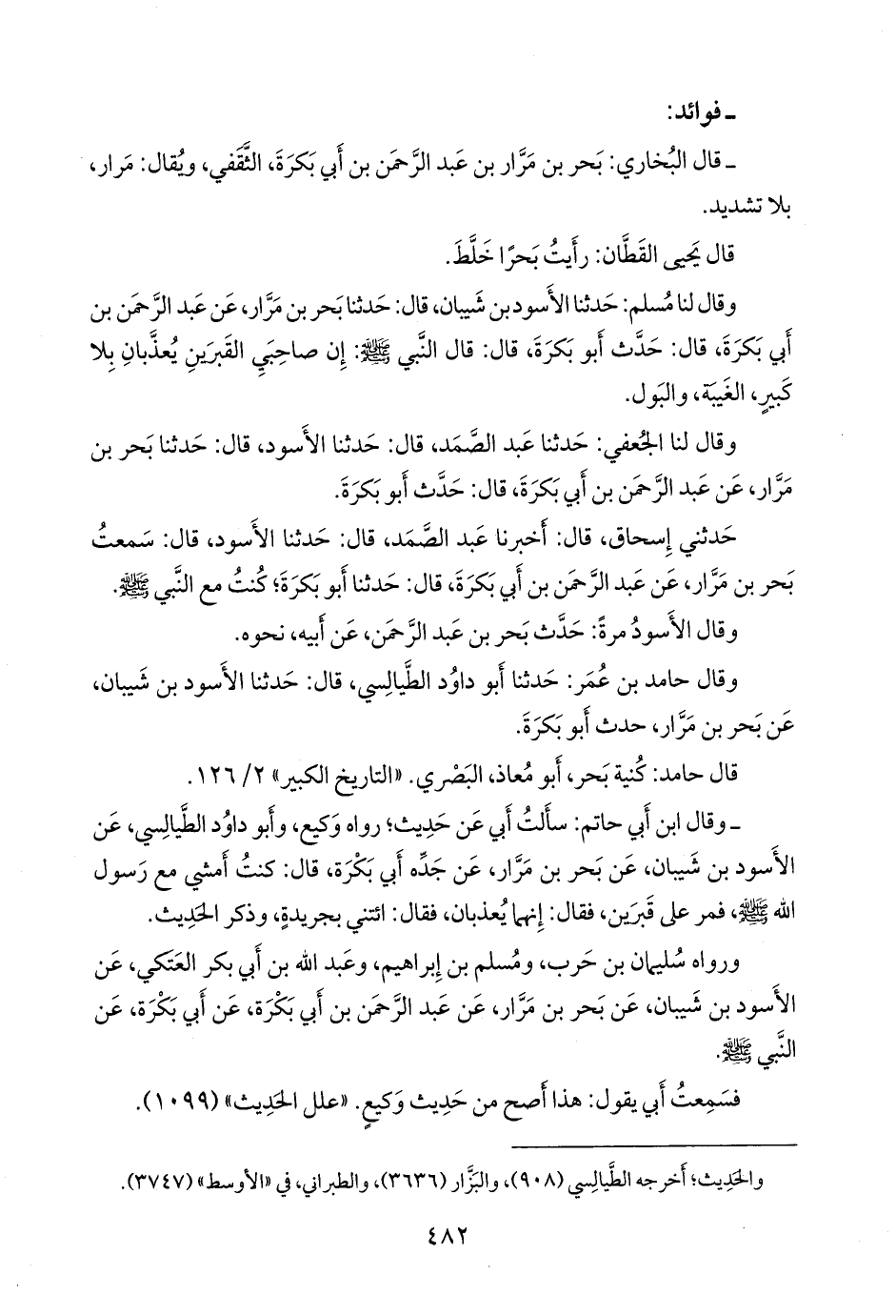 - وقال ابن أبي حاتم: سألتُ أبي عن حديثٍ؛ رواه وكيع، وأَبو داود الطيالسي، عن الأسود بن شَيبان، عن بحر بن مرار، عن جَدِّه أَبي بَكْرة، قال: كنت أمشي مع رسول الله صَلى الله عَليه وسَلم فمر على قبرين، فقال: إنهما يعذبان، فقال: ائتني بجريدة، وذكر الحديث.