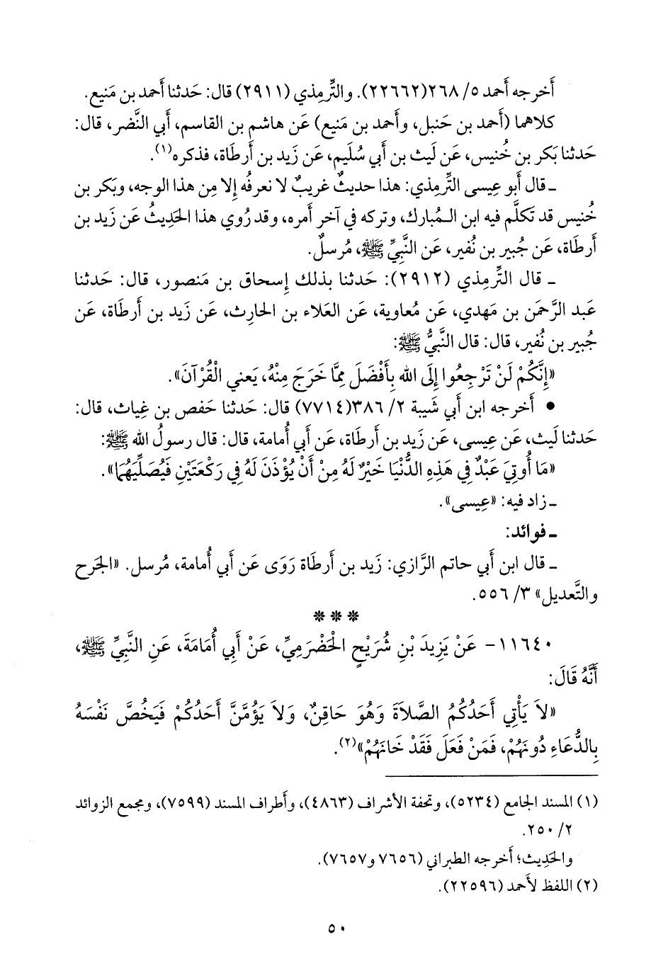 - قال التِّرمِذي (٢٩١٢): حدثنا بذلك إسحاق بن منصور, قال: حدثنا عبد الرَّحمَن بن مهدي, عن معاوية, عن العلاء بن الحارث, عن زيد بن أَرطَاة, عن جُبير بن نُفير، قال: قال النبي صَلى الله عَليه وسَلم: