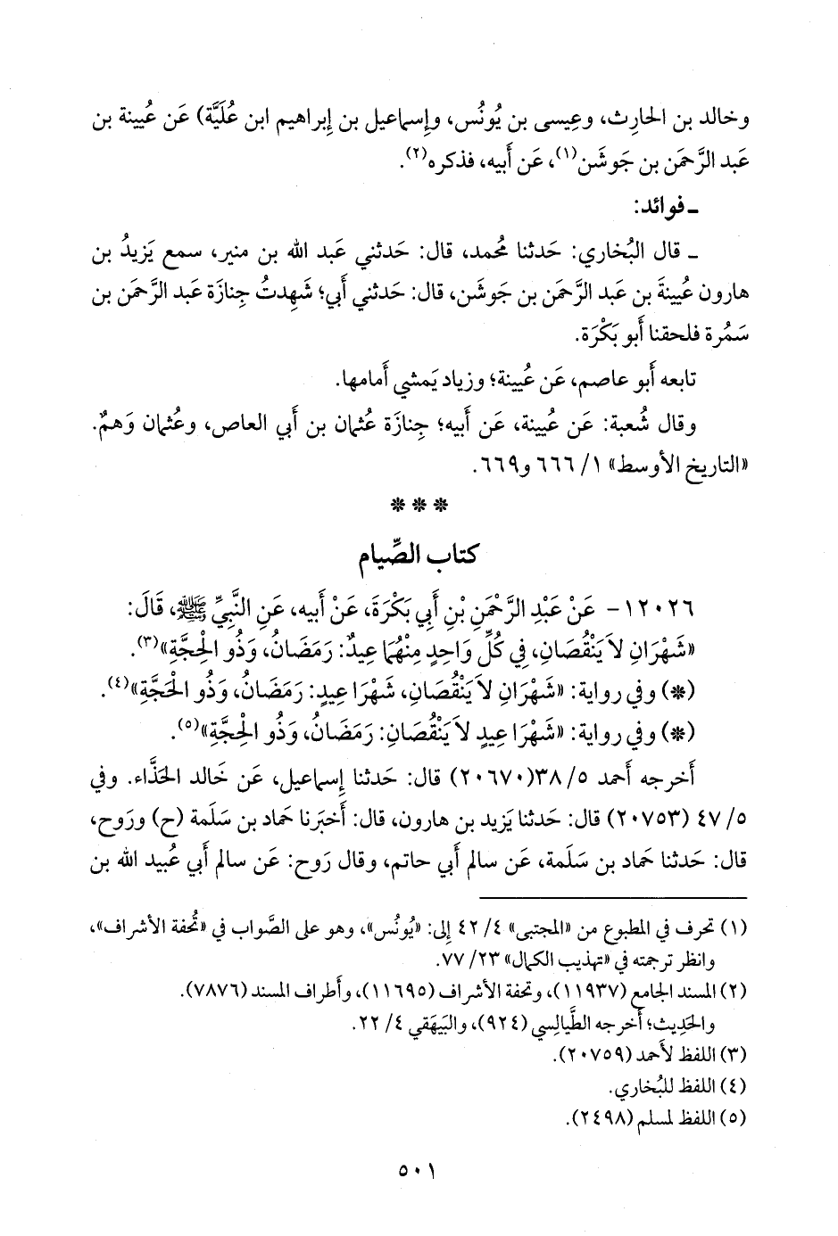 سالم (ح) وحدثنا عفان في حديث ذكره، عن حماد، عن سالم أبي عُبيد الله، وهو أيضا يكنى أبا حاتم. وفي (٢٠٧٥٩) قال: حدثنا محمد بن جعفر، قال: حدثنا شعبة، قال: سمعت خالدا الحذاء. وفي (٢٠٧٨٥) قال أَبو عبد الرَّحمَن عبد الله بن أحمد: وجدت هذه الأحاديث في كتاب أبي بخط يده: حدثنا هوذة بن خليفة، قال: حدثنا حماد بن سلمة، عن علي بن زيد. و «البخاري» (١٩١٢) قال: حدثنا مُسدد، قال: حدثنا معتمر، قال: سمعت إسحاق (ح) وحدثني مُسدد، قال: حدثنا معتمر، عن خالد الحَذَّاء.