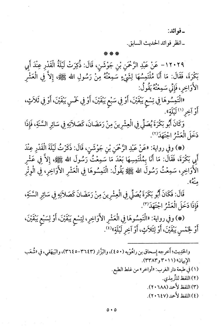 ١٢٠٢٩ - عن عبد الرَّحمَن بن جَوشنٍ، قال: ذكرت ليلة القدر عند أَبي بَكْرة، فقال: ما أنا ملتمسها لشيء سمعته من رسول الله صَلى الله عَليه وسَلم إلا في العشر الأواخر، فإني سمعته يقول: