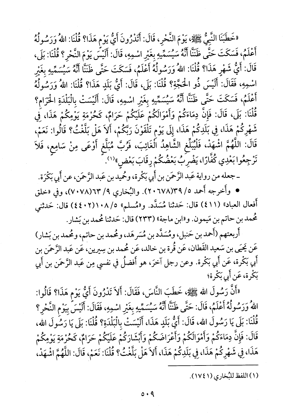 «أن رسول الله صَلى الله عَليه وسَلم خطب الناس، فقال: ألا تدرون أي يوم هذا؟ قالوا: الله ورسوله أعلم، قال: حتى ظننا أنه سيسميه بغير اسمه، فقال: أليس بيوم النحر؟ قلنا: بلى يا رسول الله، قال: أي بلد هذا، أليست بالبلدة؟ قلنا: بلى يا رسول الله، قال: فإن دماءكم وأموالكم وأعراضكم وأبشاركم عليكم حرام، كحرمة يومكم هذا، في شهركم هذا، في بلدكم هذا، ألا هل بلغت؟ قلنا: نعم، قال: اللهم اشهد،