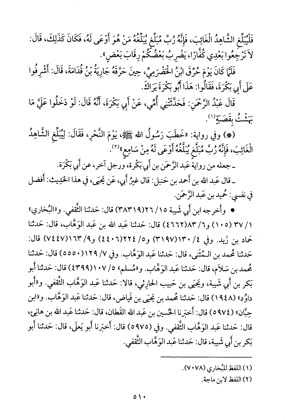 كلاهما (عبد الوَهَّاب الثقفي، وحماد بن زيد) عن أيوب السَّخْتِياني، عن محمد بن سِيرين، عن ابن أَبي بَكْرة، عن أَبي بَكْرة، عن النبي صَلى الله عَليه وسَلم قال: