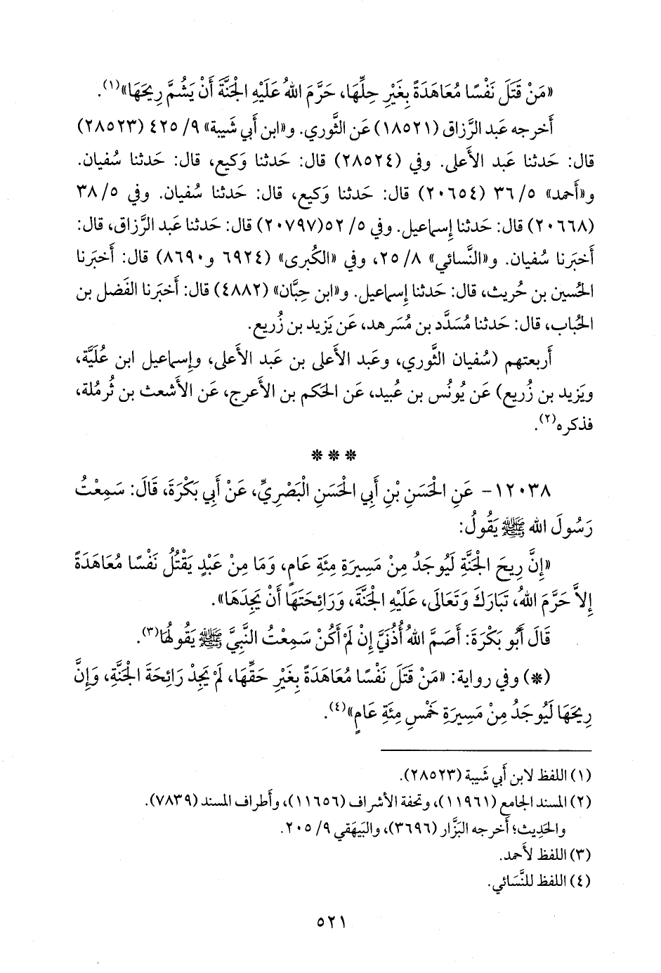 «إن ريح الجنة ليوجد من مسيرة مئة عام، وما من عبد يقتل نفسا معاهدة إلا حرم الله، تبارك وتعالى، عليه الجنة، ورائحتها أن يجدها».