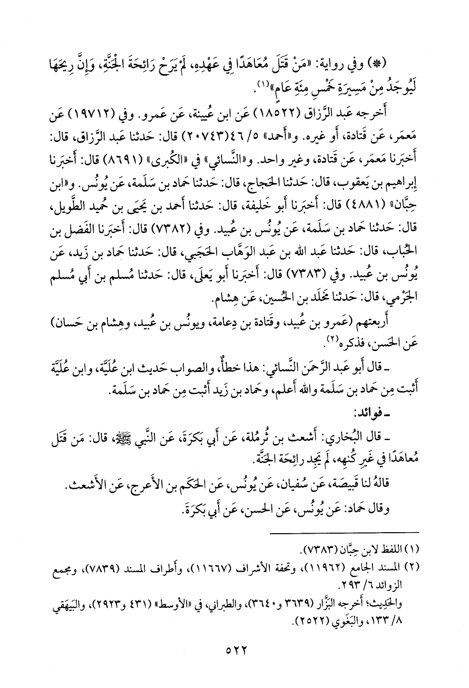 - قلنا: إِسناده ضعيفٌ؛ قال البخاري: أشعث بن ثرملة، عن أَبي بَكْرة، عن النبي صَلى الله عَليه وسَلم قال: من قتل معاهدا في غير كنهه، لم يجد رائحة الجنة.